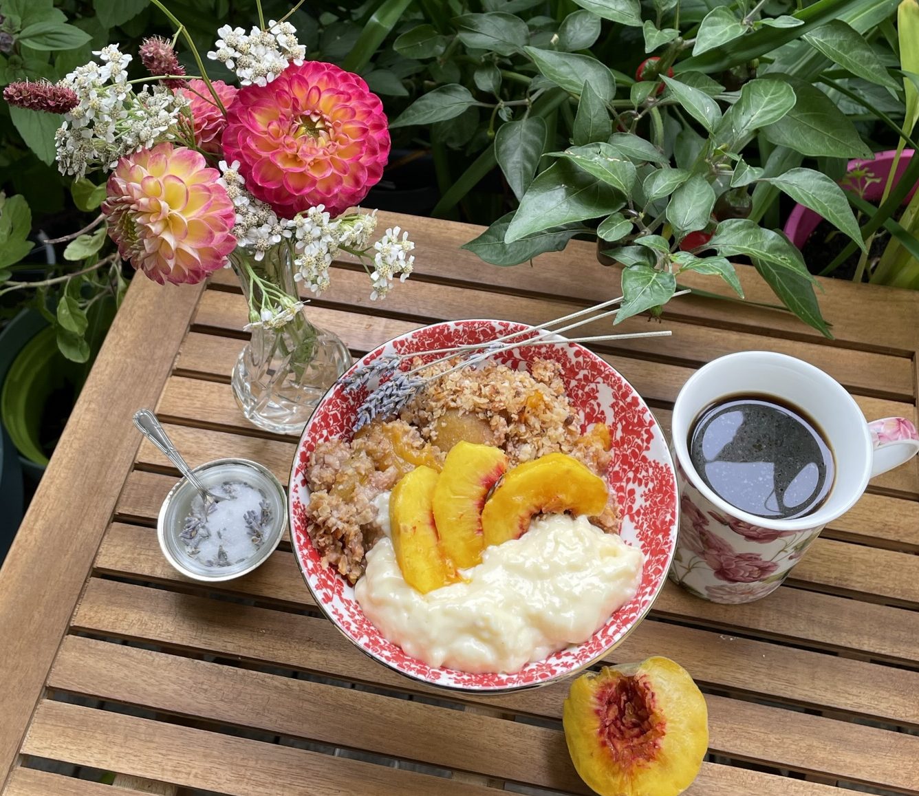Aber immerhin hat mein Bäumchen geliefert. Ansonsten war das gesamte Steinobst bei uns in diesem Jahr ein Totalausfall durch den Frost in der Blühphase des Steinobstes. Keine Kirschen, Pfirsiche (am Baum im Garten) oder Pflaumen. Umso mehr genießen wir die insegesamt 10 saftig, frische, gelbfleischigen Früchtchen aus unserem Balkonobstgarten. Gleich vor Ort. Mein geliebtes Crumble gibt es dann wieder nächstes Jahr.