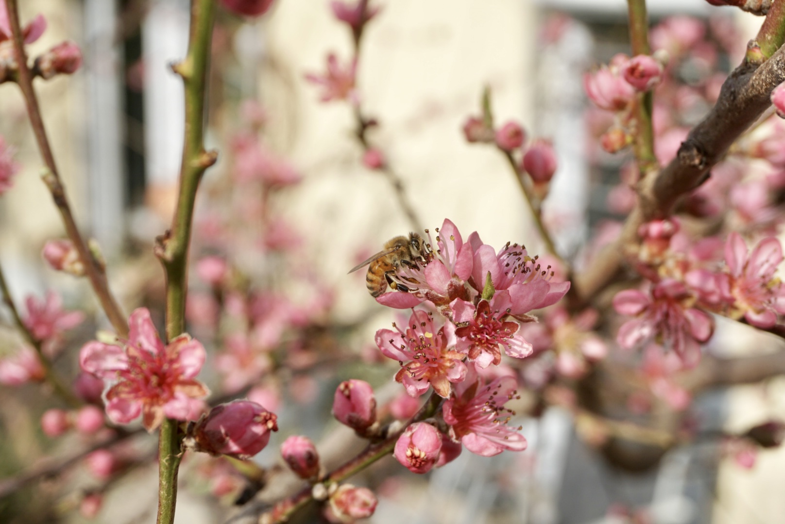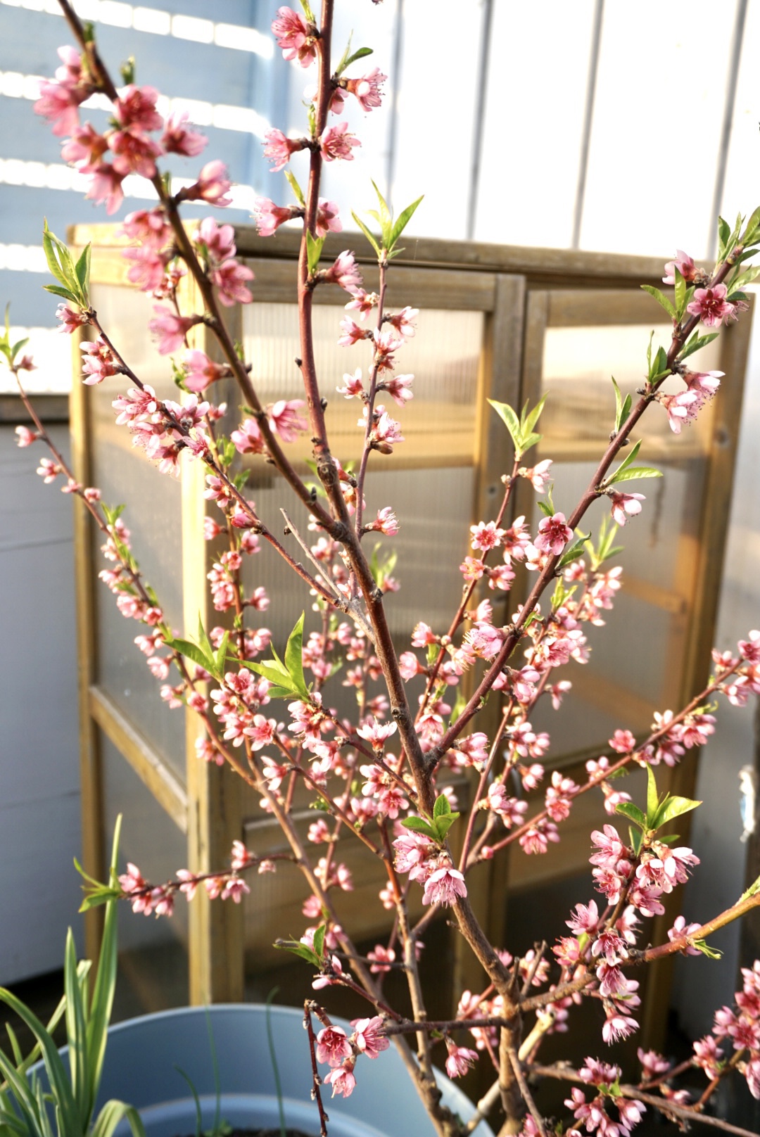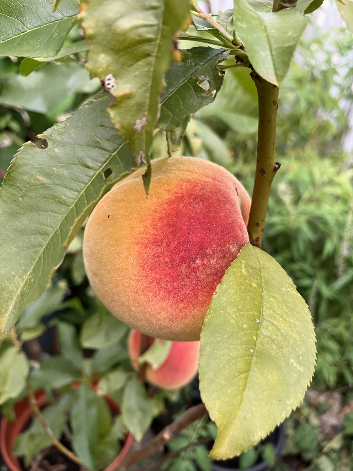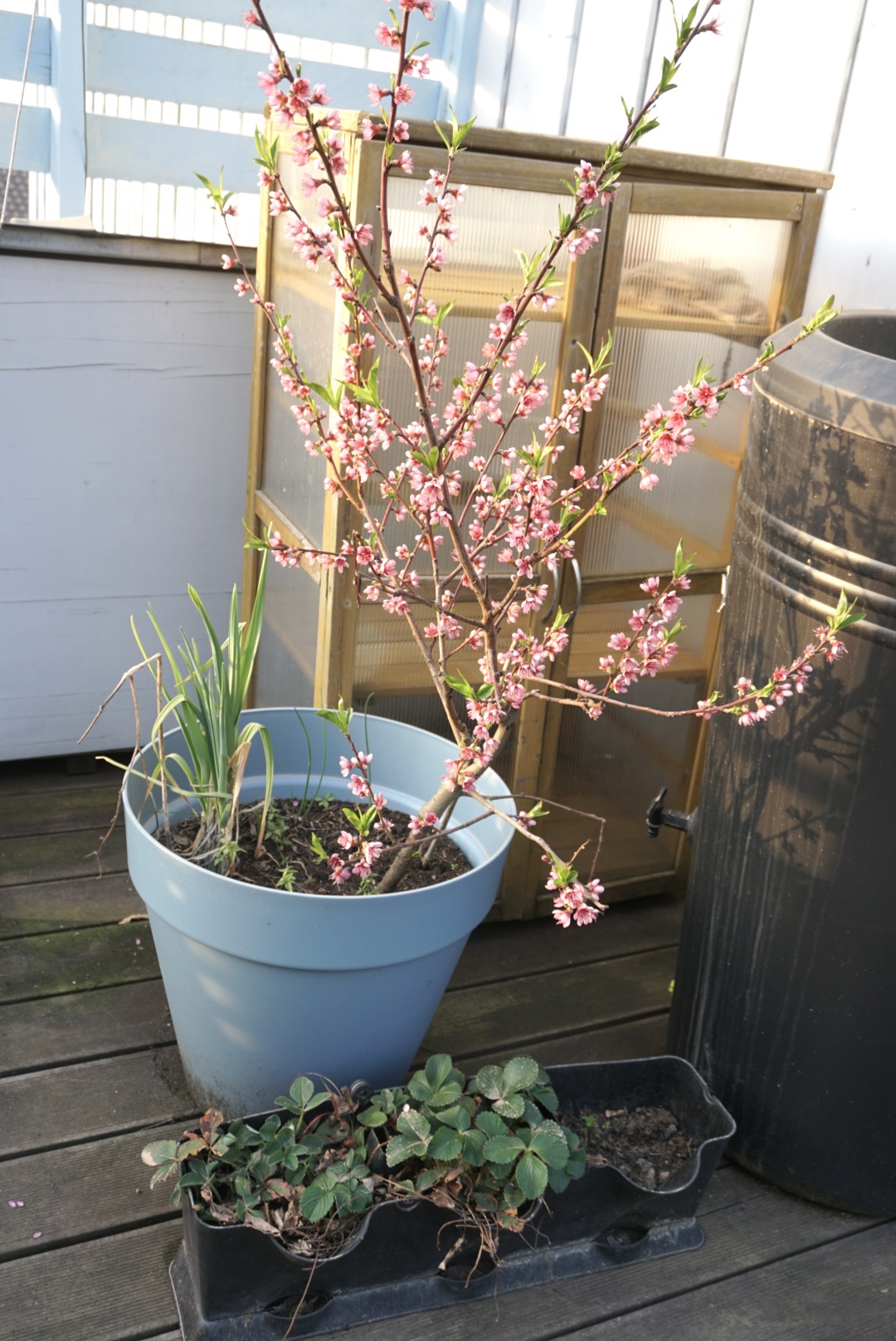 Mir war gleich klar, dass der Frost uns die Ernte „verhageln“ wird. Deshalb habe ich die Töpfe mit dem ebenfalls blühenden Pfirsichbäumchen ‚Fruit Me® Peach Me Yellow‘ und die Kiwibeeren in den Schopf gezogen. Dazu ein Vlies über die Blüten. Das hat funktioniert, wie man sieht. Zumindest beim Pfirsichbäumchen sind die Blüten nicht erfroren. Bei den Kiwibeeren gibt es auch dieses Jahr wieder nichts zu ernten. Doch die Ursache ist eine andere und mir leider noch unbekannt. Es könnte an einer Überdüngungen liegen – ach, ich weiß es einfach nicht. Dafür gibt es den leckeren Pfirsich.