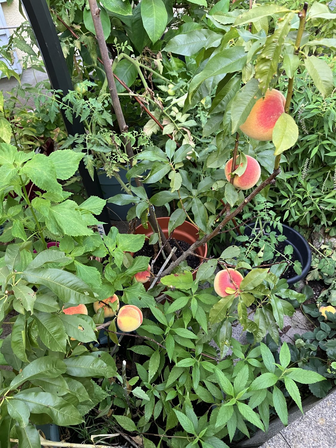 Es sind nicht viele Früchte, aber sie sind wirklich lecker. Die Pfirsiche von meinem Bäumchen auf der Terrasse. Hier sitzt in einem 50 cm Topf ein gelber Fruit Me® Peach „Me Yellow“ von Volmary. Diese Pfirsich Sorte ist gezielt für den Anbau in Kübeln gezüchtet. Und es funktioniert auch wirklich gut.