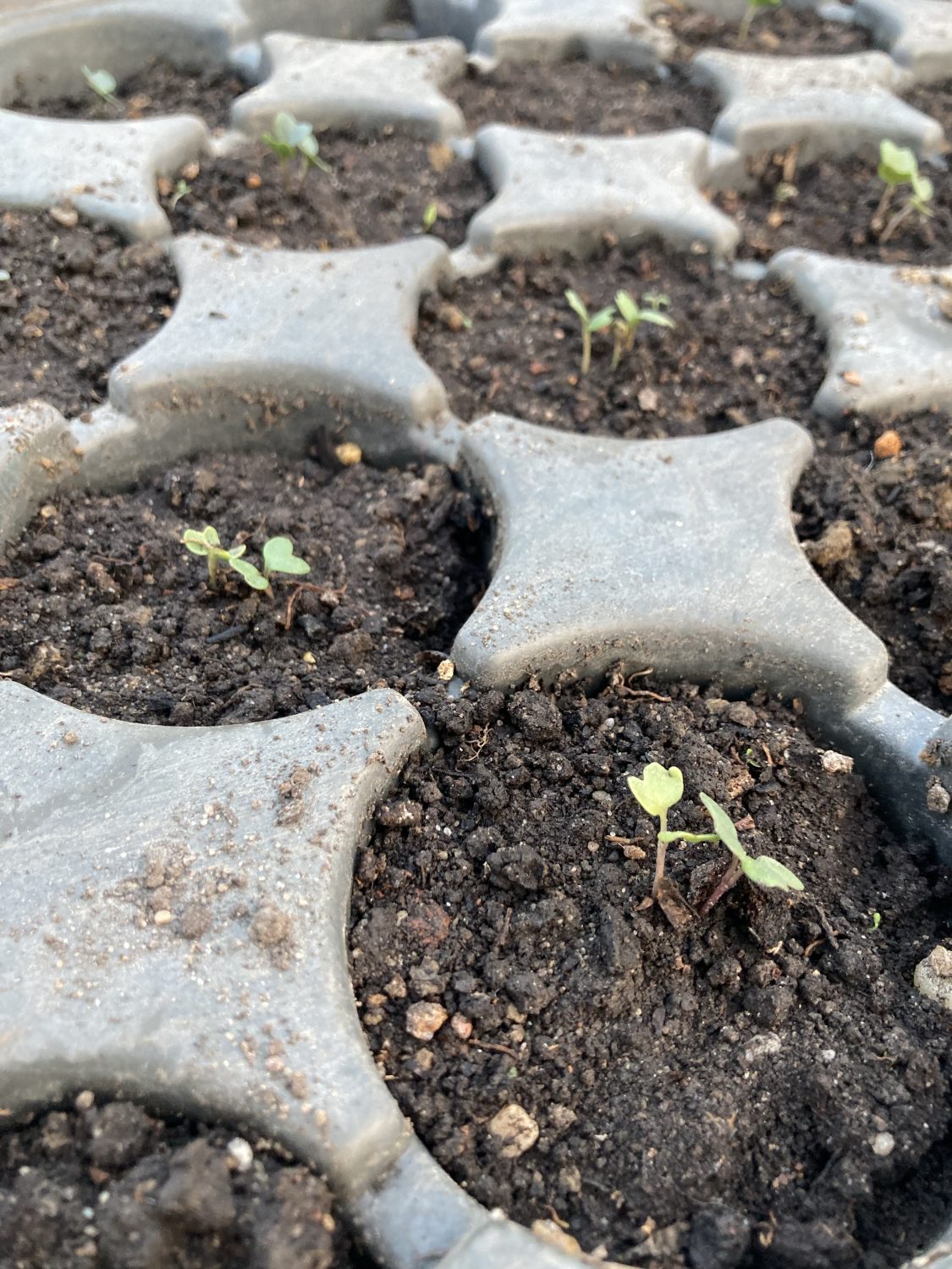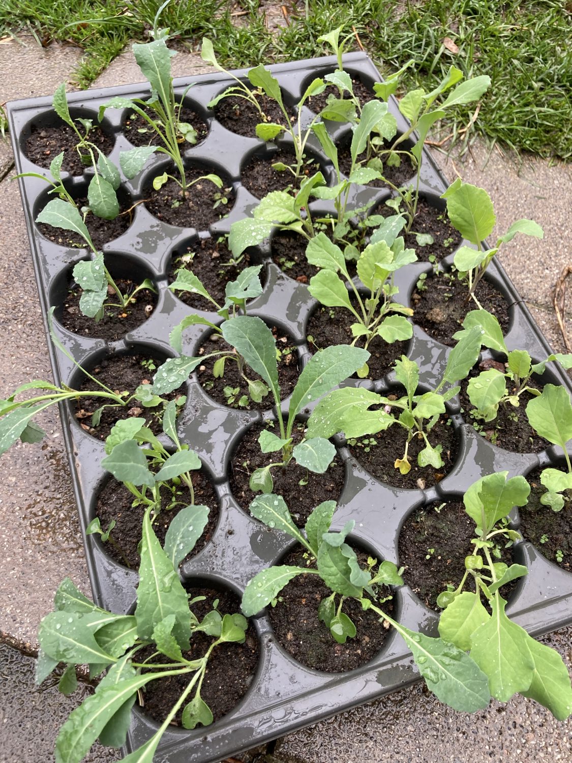Ab Ende März haben hier die Samen des purpurnen Blumenkohl gekeimt. Im Mai waren die Setzlinge groß genug, um nach Draußen zu ziehen. Allerdings gab es zu diesem Zeitpunkt kein freies Plätzchen mehr in den Gemüse- und Hochbeeten. Also standen ettliche Kohlpflänzchen erst mal in größeren Töpfen herum. Bis sich im Juli doch noch ein Platz in den wieder frei werdenden Beeten fand. Hier hatten zuvor die Erbsen gesessen, welche mal wieder in der Hitze verdorrt sind.