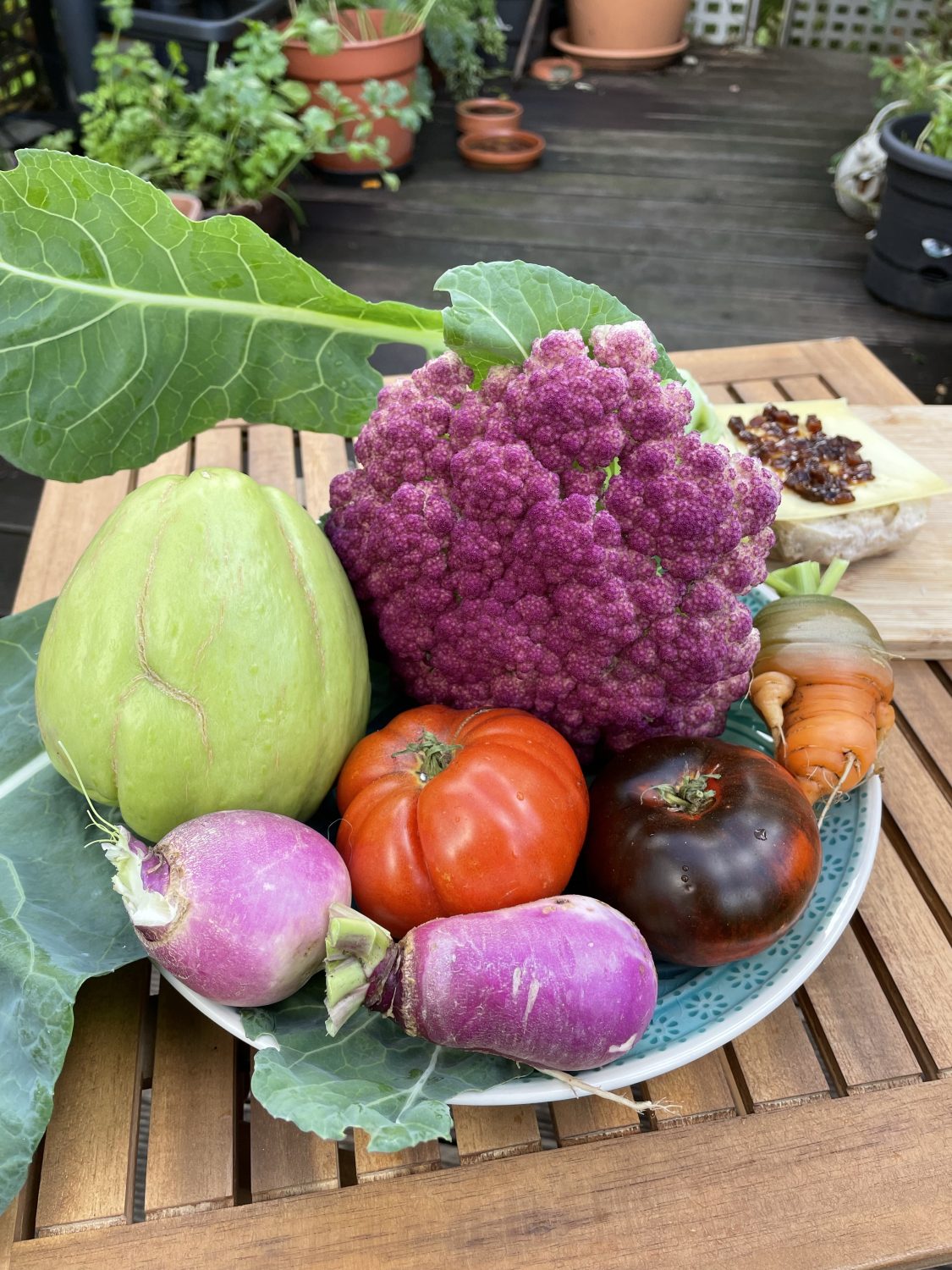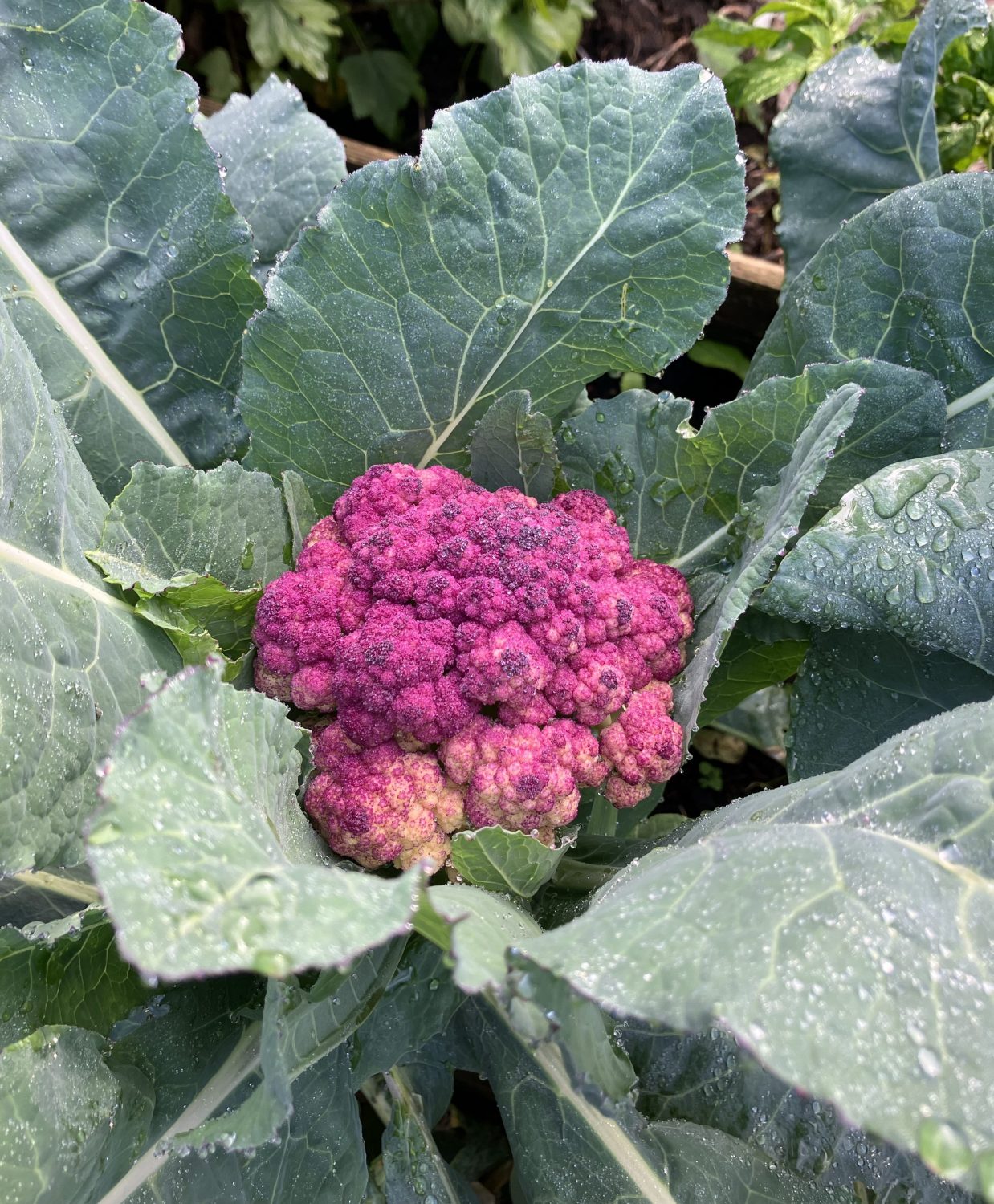 Erbsen gab es nur Wenige zu Ernten. Dafür konnten die Erbsenpflanzen ordentlich Stickstoff in der Erde anreichern. Gut für den Kohl. Das und ein ordentlicher Schluck Wurmhumus haben dem Blumenkohl auch über den Hitzesommer geholfen. Durch den Wurmhumus kann die Erde mehr Wasser speichern. Ende September zeigten sich die ersten purpurnen Röschen.