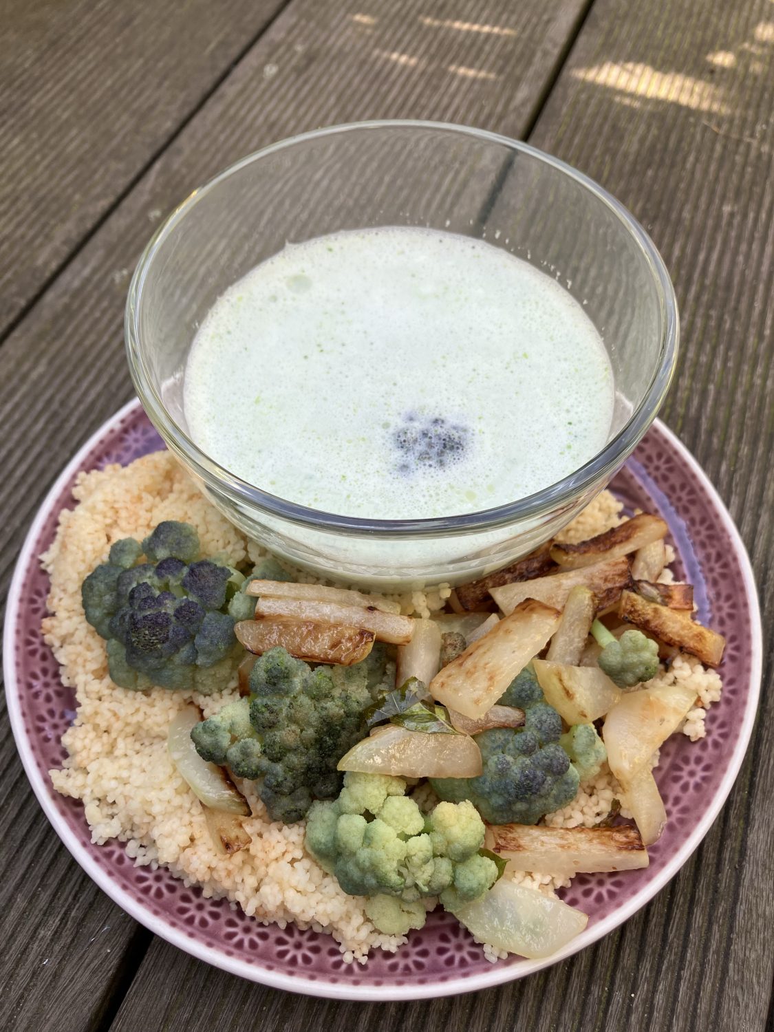 Die blanchierten Röschen brate ich als Gemüse an. Diesmal mit einer in Stifte geschnittenen Kohlrabi, damit es für zwei hungrige Personen reicht. Das Gemüse wird auf Couscous serviert. Simpel und wenig gewürzt, schmeckt dieses Gericht mal wieder besonders durch die guten Zutaten, frisch geerntet aus dem eigenen Garten.