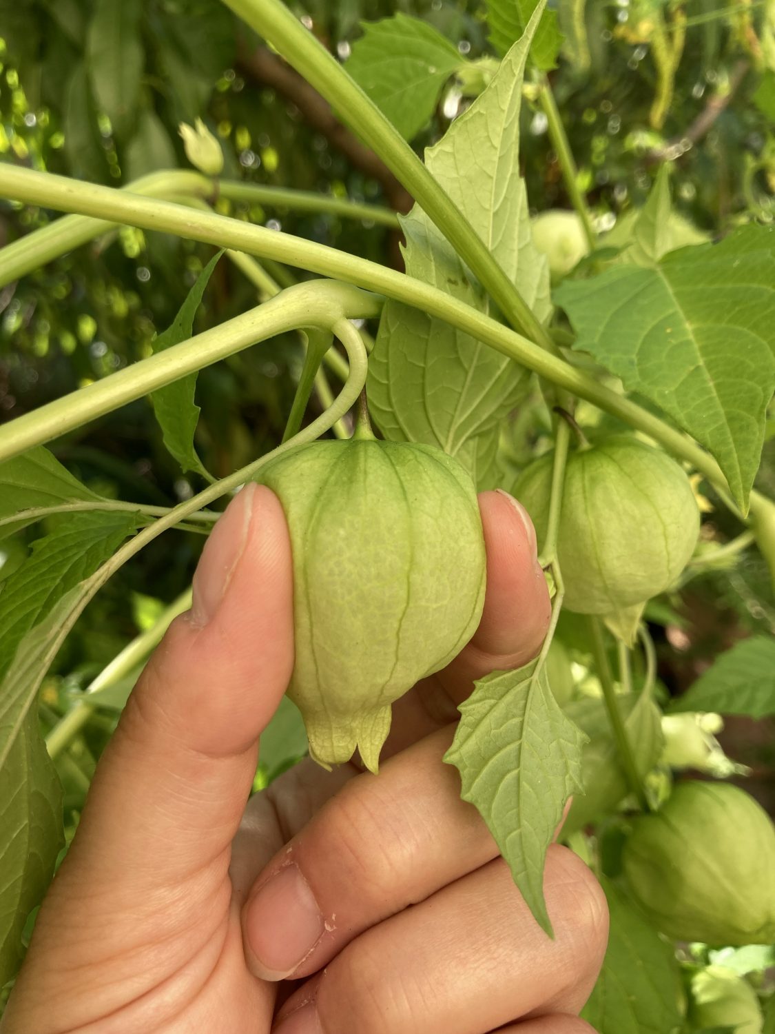 Bei zu viel Stickstoff bilden die Pflanzen viel Blattwerk, aber wenig Blüten bzw. Früchte. Also sparsam düngen. Eine Tomatillo Pflanze kann überraschend groß werden. Einen 40 cm Pflanztopf füllt sie problemlos alleine aus. Für die gute Fruchtbildung hilft es, wenn man ab und an mit dem Pinsel selber Bestäuber*in spielt.