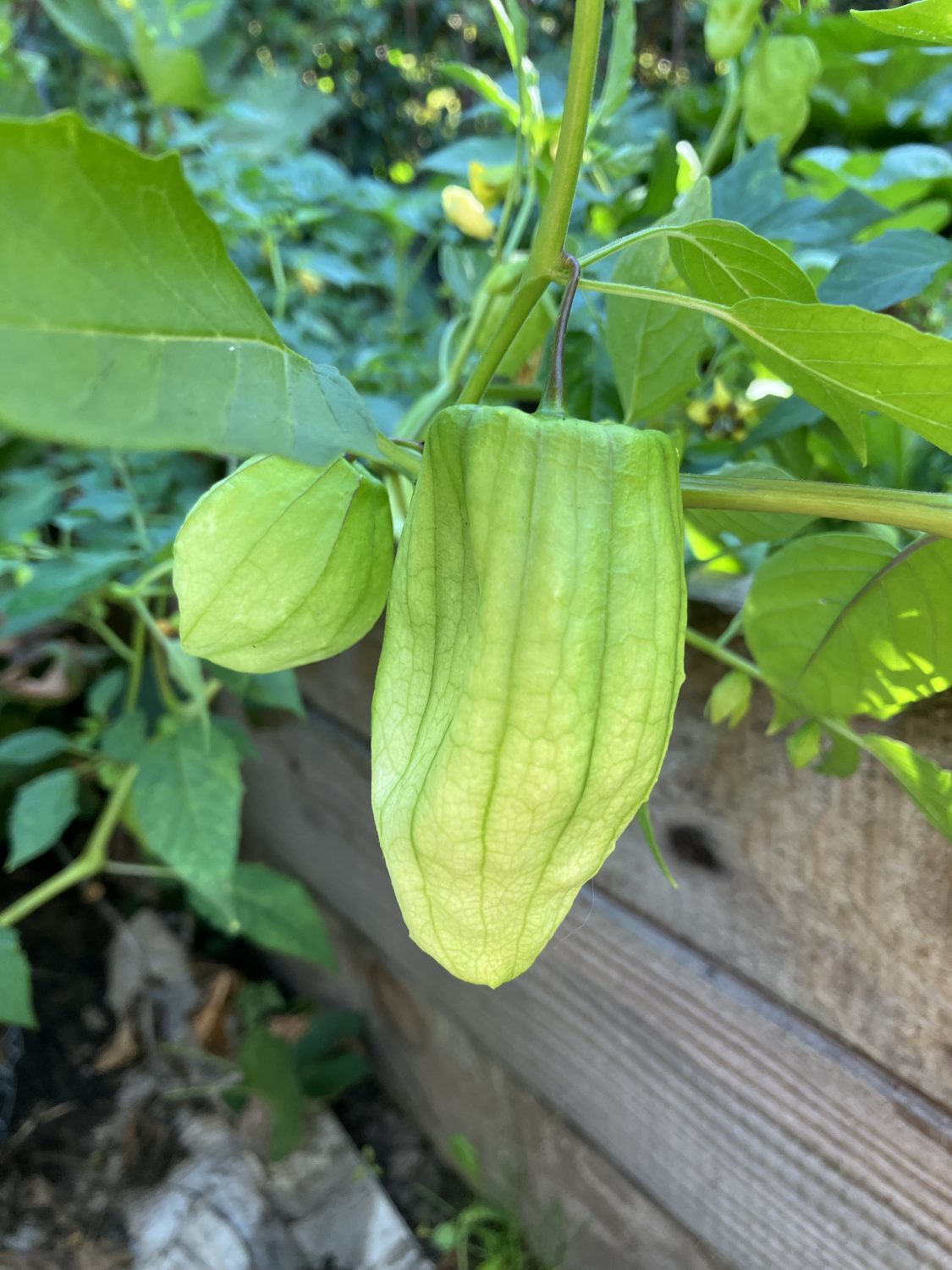 Die Setzlinge der Queen hatte ich im Juni in ein Hochbeet gepflanzt. Aufgrund der Hitze und Trockenheit sah es lange so aus, als ob sie keine Früchte bilden. Meine Freude war groß, als ich am 4. September die ersten Fruchthüllen entdeckt habe. Die Kelchblätter waren da noch klein, grün und ziemlich leer. Es dauert, bis die Frucht die Hülle sprengt.