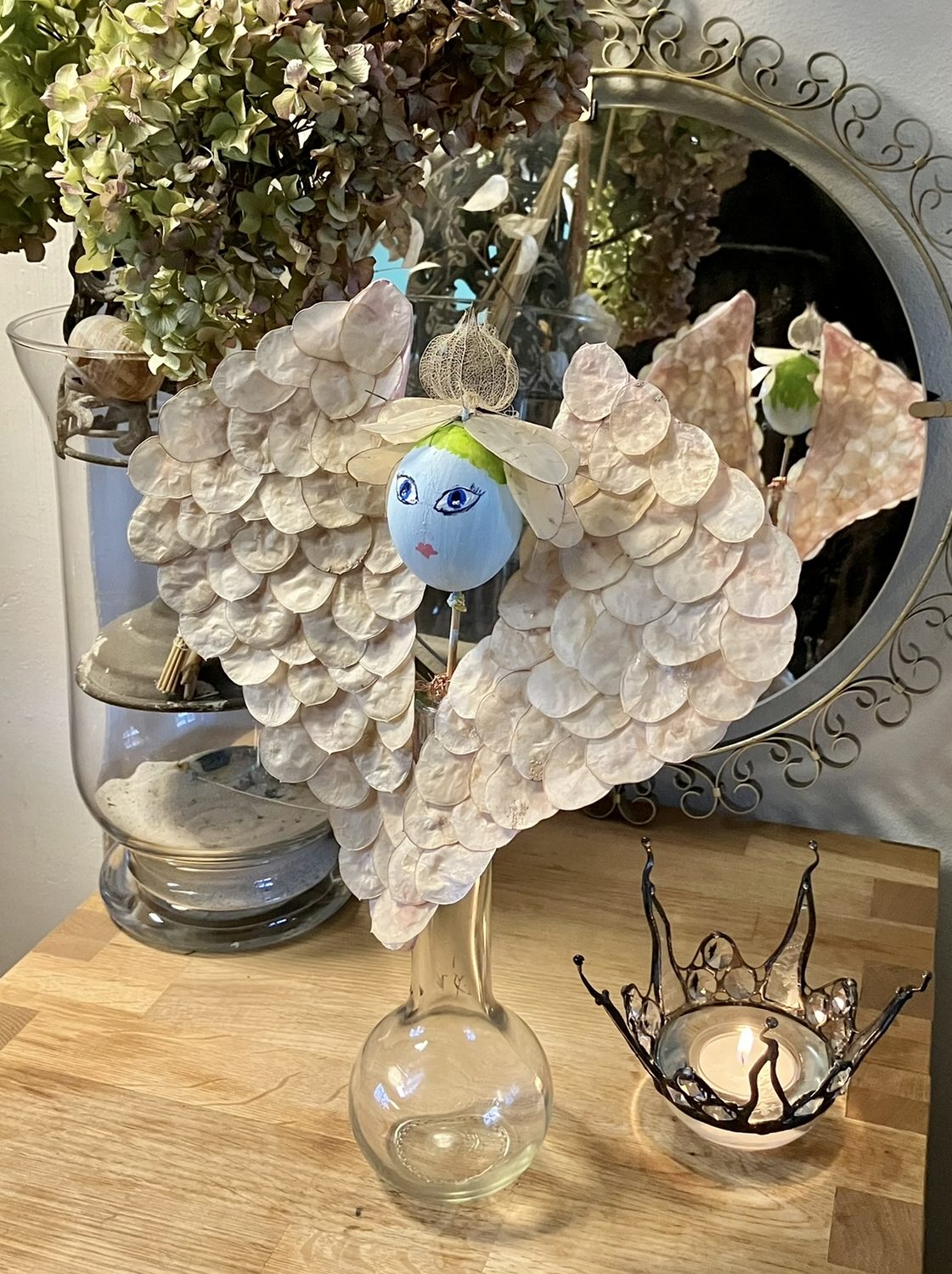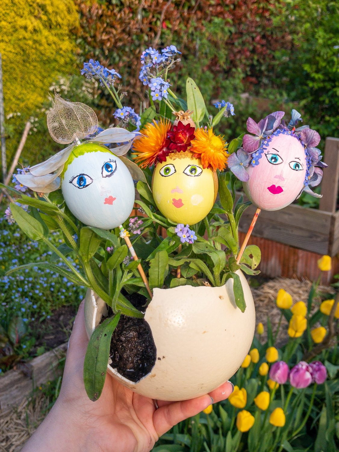 Neben den Trockenblumen gibt es noch viele andere Pflanzen bzw. Pflanzenteile, welche sich für ein Trockengesteck eignen. Mir gefallen zum Beispiel die skelletierten Lampionhüllen von Tomatillo und Physalis sehr gut. Die Überraschend stabile Gerippe sehen nicht nur als Kopfschmuck auf meinen Ostergesichtern sehr hübsch aus.
