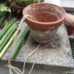 Zuerst den Bindfaden durch das Wasserloch im Topf fädeln und eine Schlaufe binden. Daran wird das Bienenhotel später aufgehängt. Deshalb einen dicken und stabilen Bindfaden verwenden.