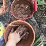 Jetzt kommt der spaßige Teil für die Kids. Der matschige Lehm wird in den Blumentopf gefüllt. Knapp ein Drittel voll mit dem Matsch sollte er sein. Ordentlich rein drücken, damit die Bambusstücke später gut darin halten.