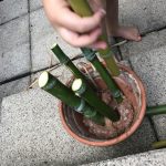 Nun werden die Bambusstücke mit der Röhrenöffnung nach oben, in den Lehm gesteckt. also die geschlossene Seite – mit den Noiden – fest in den Lehm drücken. So viel Bambus wie möglich in den Lehm hinein stecken, bis sie dicht an dicht stehen. Sie müssen dabei nicht korrekt alle in eine Richtung schauen.
