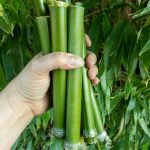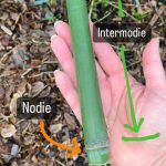 Für die anderen Bastelarbeiten brauche ich Stücke vom Bambus. Die Bambusstücke jeweils direkt hinter der Nodien – die verdickten Wachstumknoten am Bambushalm – abschneiden. Sie bilden so einen Boden der ansonsten hohlen Bambus Stücke. So kannen daraus Bambusvasen oder auch Nisthöhlen für Wildbienen gebastelt werden. Die Bambusstücke sollten schon etwas getrocknete sein. Die Papierhaut im Inneren kann mit einer dünnen Flaschenbürste oder Strohhalmbürste entfernt werden.
