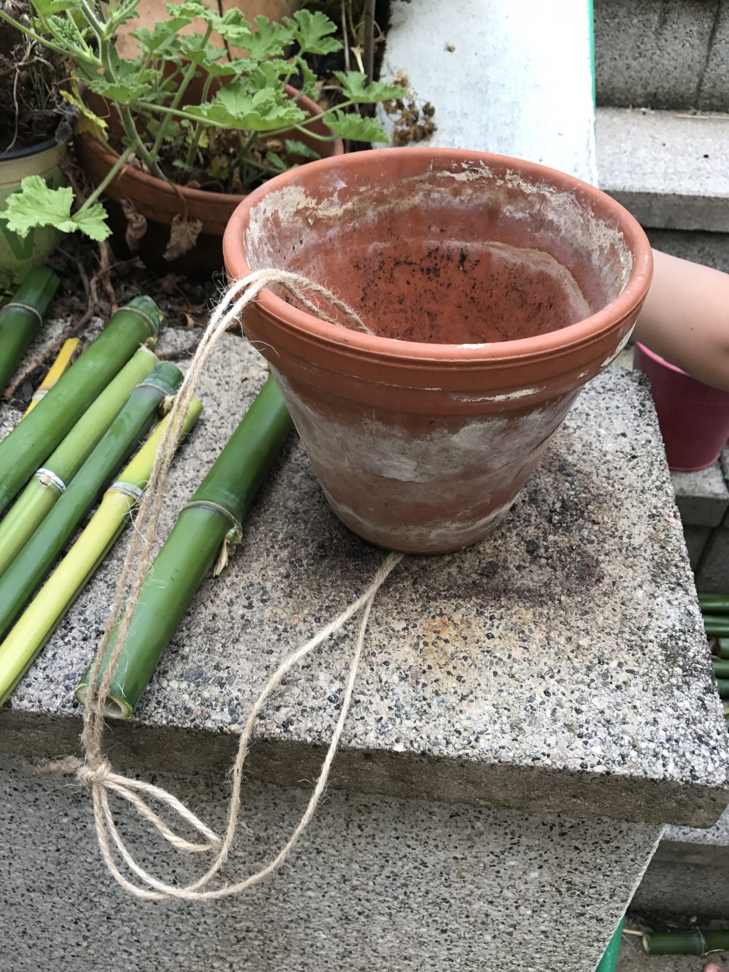 Zuerst den Bindfaden durch das Wasserloch im Topf fädeln und eine Schlaufe binden. Daran wird das Bienenhotel später aufgehängt. Deshalb einen dicken und stabilen Bindfaden verwenden.