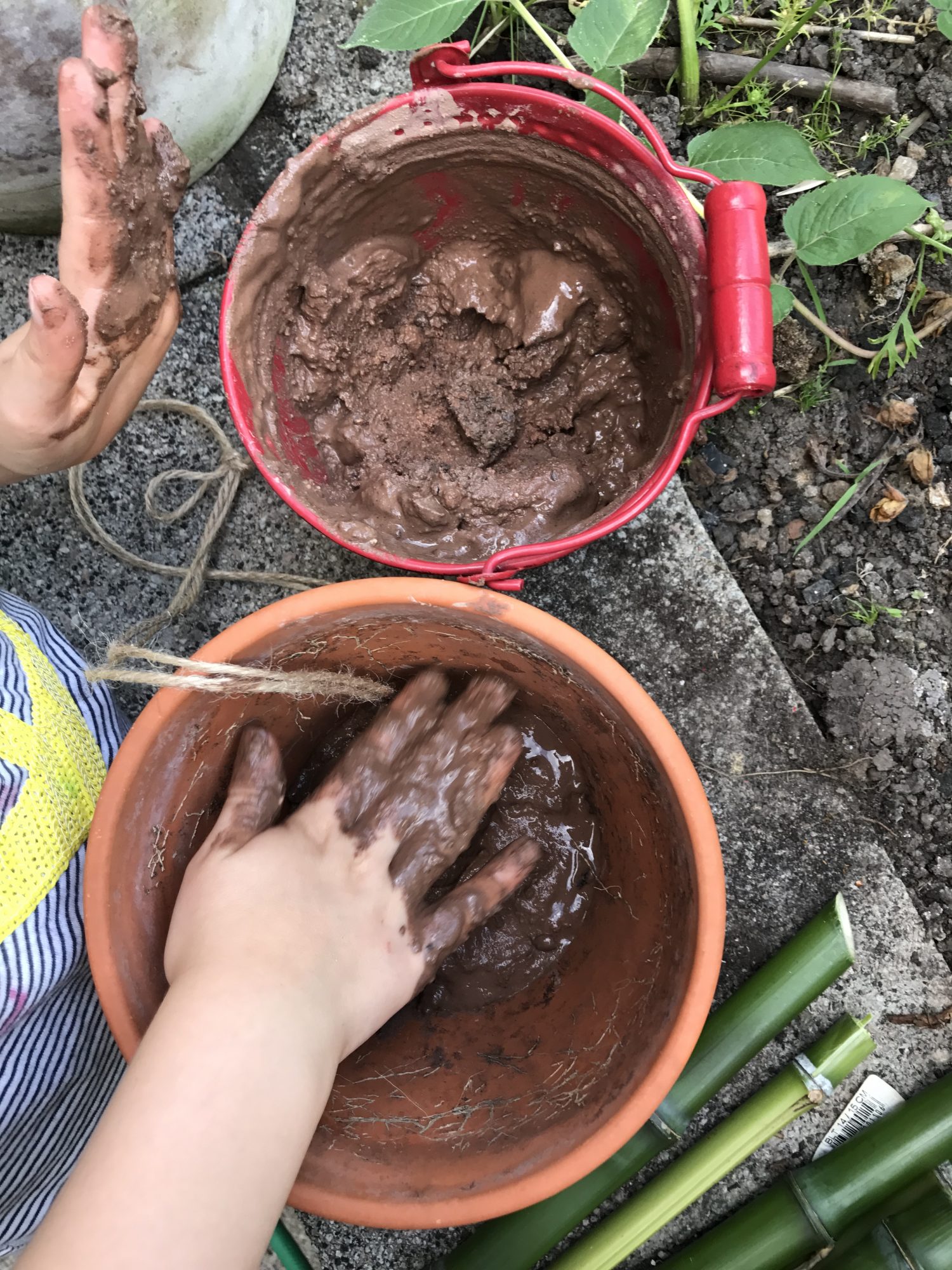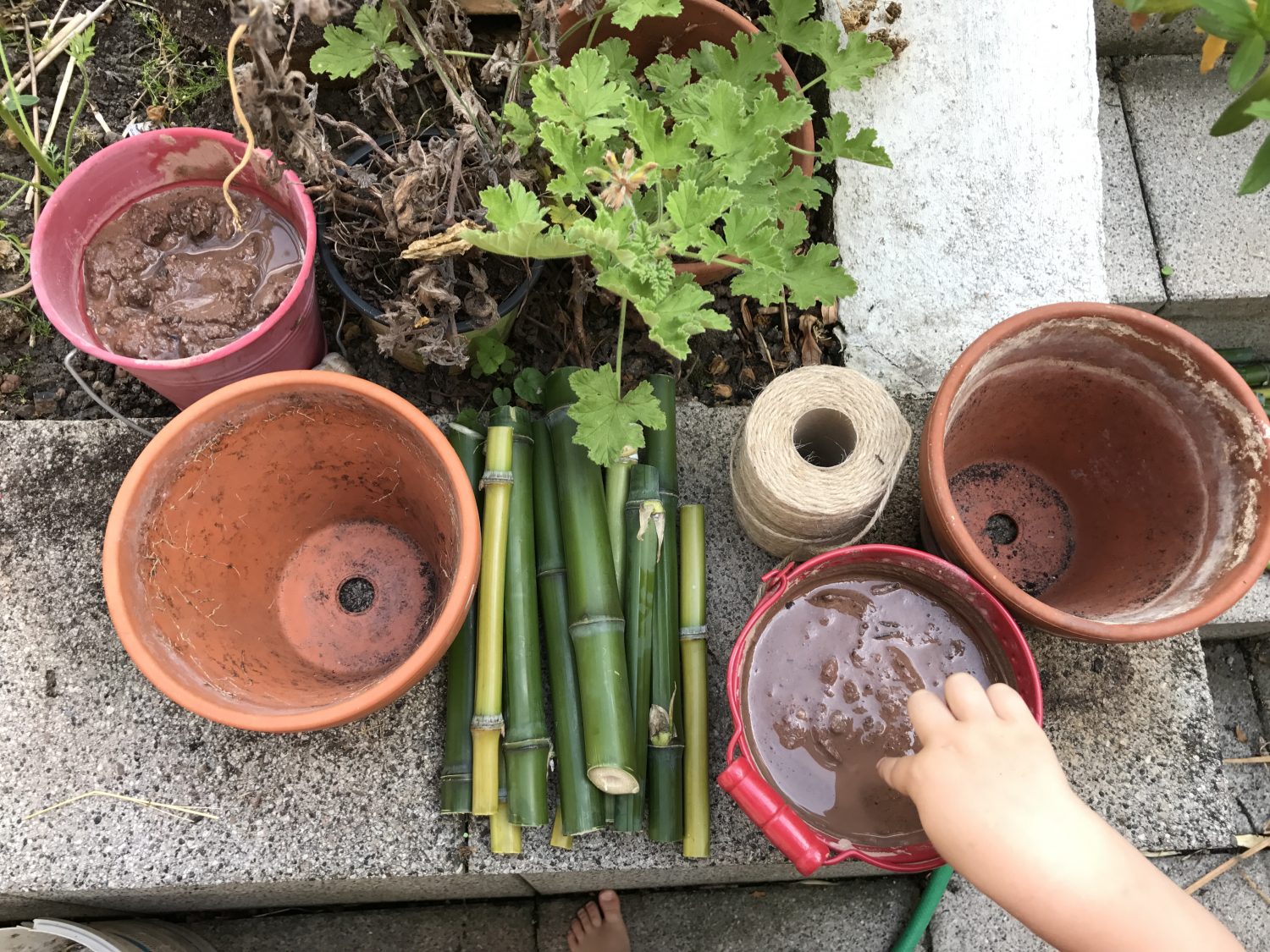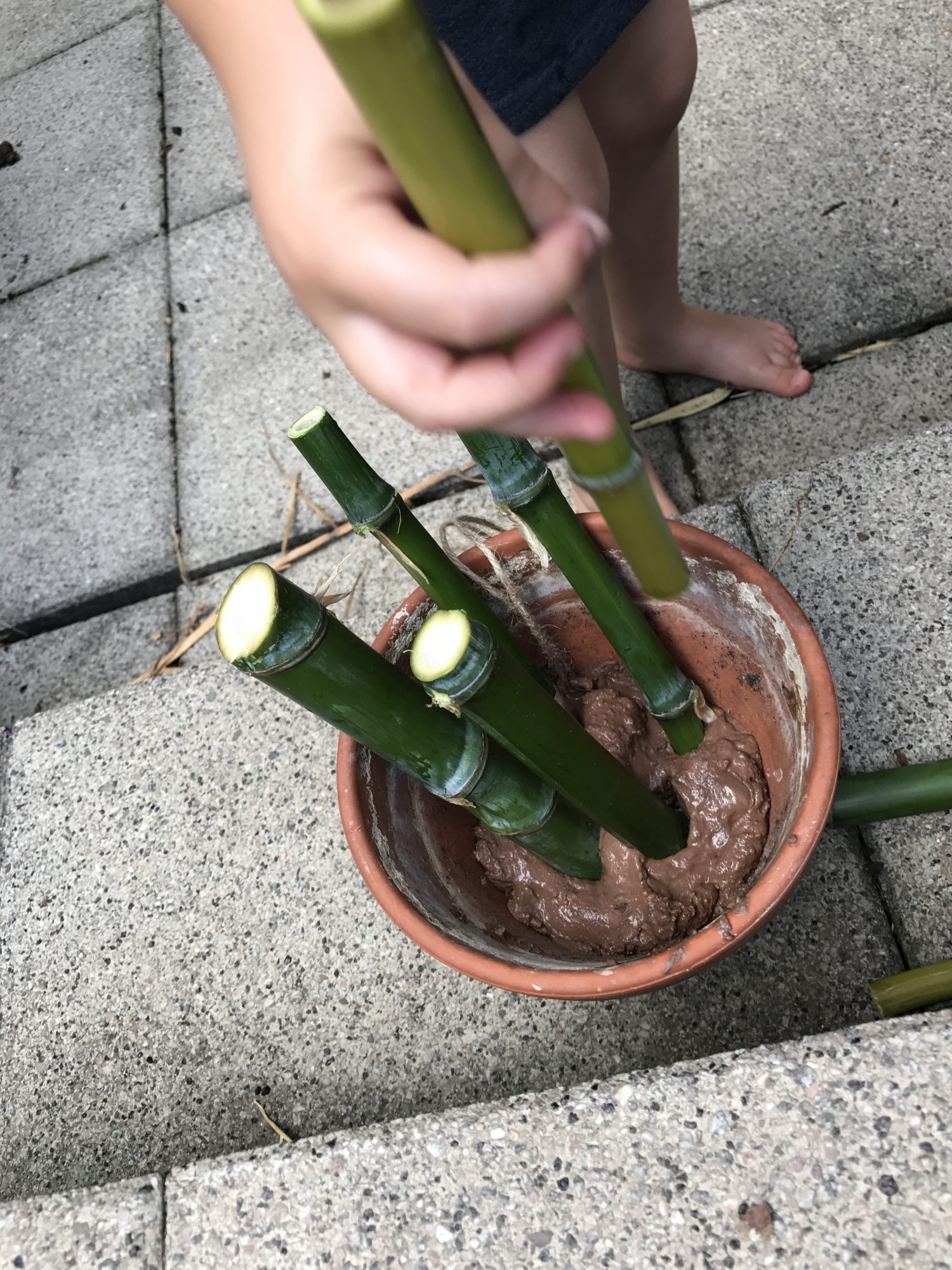 Jetzt kommt der spaßige Teil für die Kids. Der matschige Lehm wird in den Blumentopf gefüllt. Knapp ein Drittel voll mit dem Matsch sollte er sein. Ordentlich rein drücken, damit die Bambusstücke später gut darin halten.