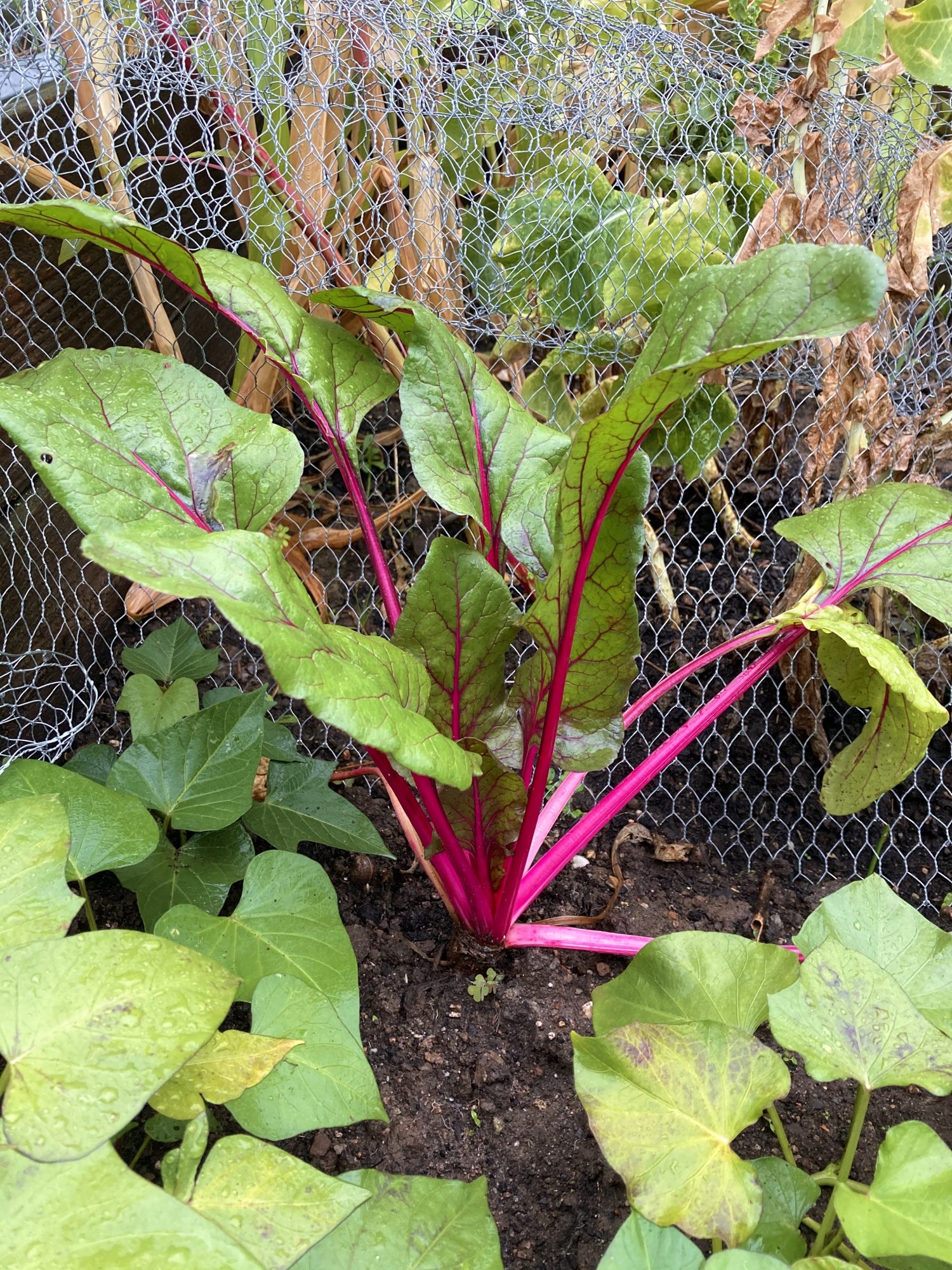 Bei der Mischbeet Idee von Nathalie @wildesgartenherz sitzen im Beet neben purpurnem Grünkohl und rotem Mangold: Fackellilie, Schmuckkörbchen, roter Wiesenknopf und eine Artischocke.