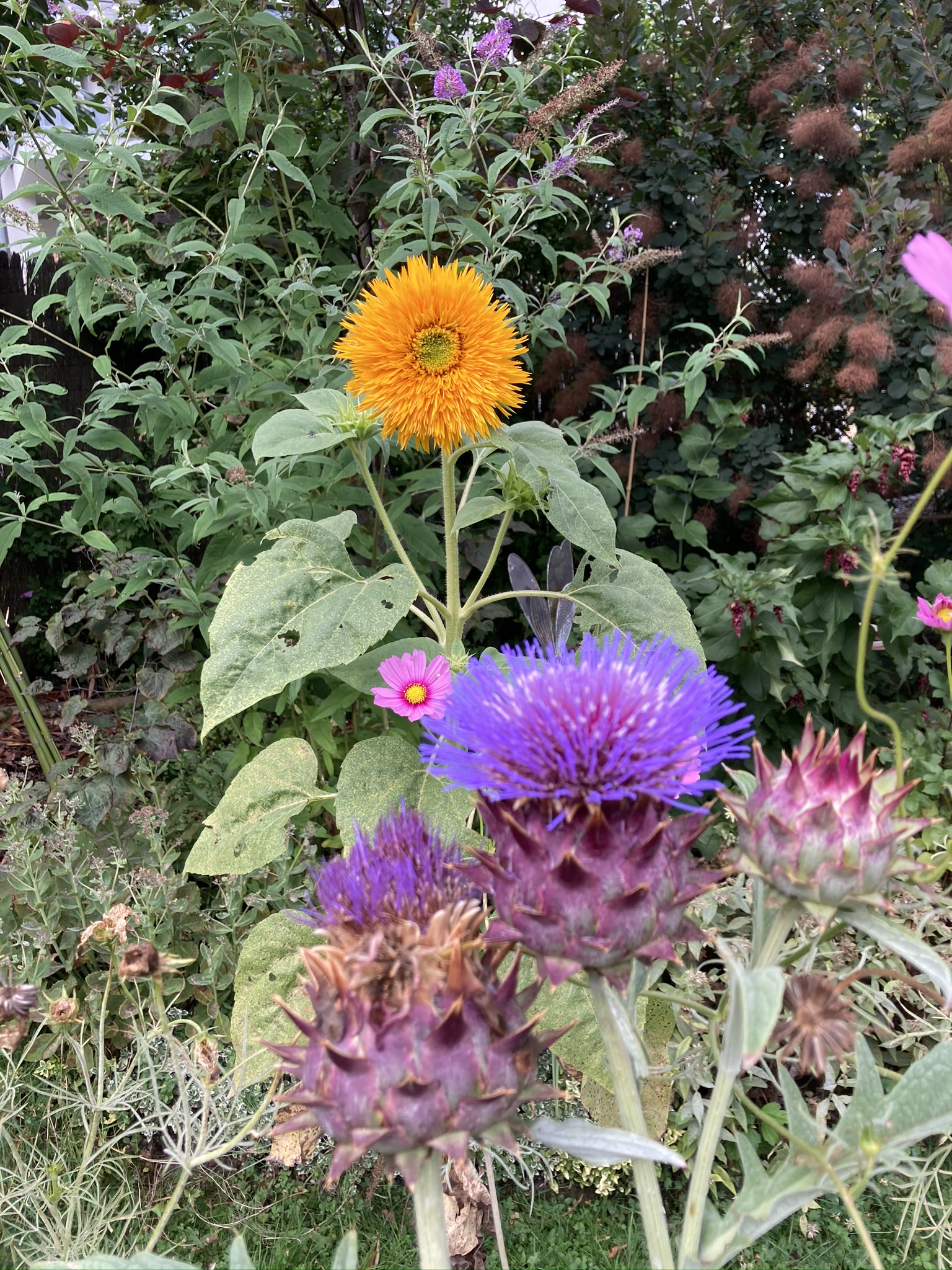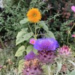 Richtig spektakulär kommen die Korbblütler Artischocke (Cynara scolymus) und Kardy im Mischbeet. Beide sind die Ausnahme, weil Mehrjährig. Auch brauchen sie mehr Platz. Dafür ist gerade die hochgewachsene Kardy ein guter Hintergrund im Beet.