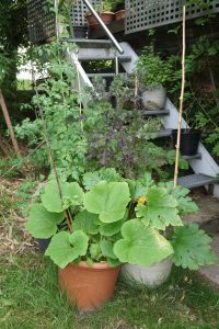 Ein weiterer Mischkultur-Pflanzkübeln stehen an der Gartentreppe. Hier wachsen Zucchini und ein zweijähriger, roter Grünkohl in dem einem Pflanztopf. Im Zweiten sind Tropfenpaprika, Tomate und eine kleine Kürbissorte.
