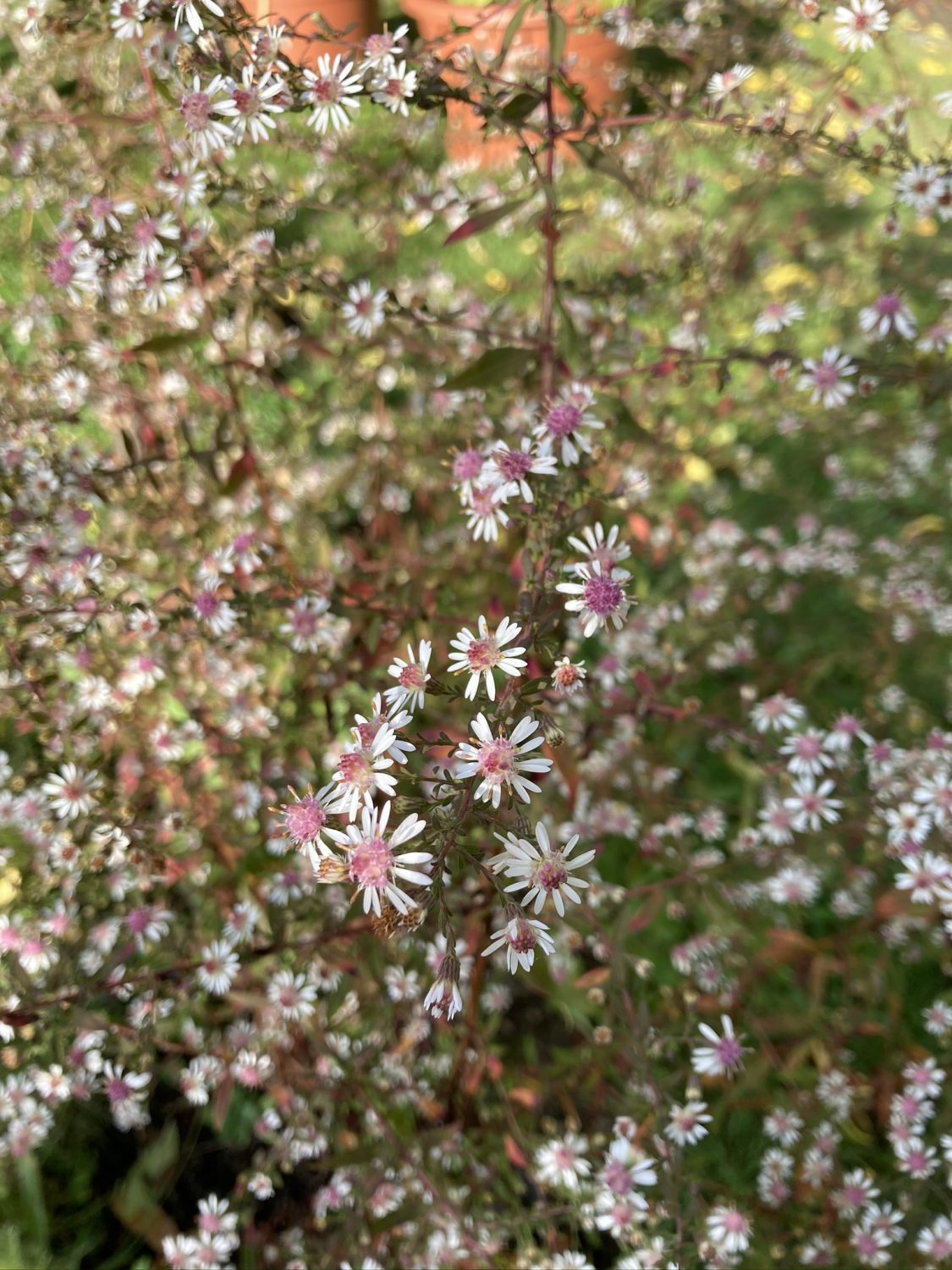 Die Aster macht sich hingegen sehr gut. Darüber freue ich mich wirklich. Diese Aster ist der überlebende Rest meiner Lieblingspflanze aus England. Die saß bis im letzten Sommer in einem Rasenbeet. Erst im September ist mir aufgefallen, dass der Aster Wasser fehlt. Ich dachte immer, Astern sind Trockenheitsverträglich und habe sie nie gegossen. Tja, sie kommt mit weniger Wasser klar. Aber so gar kein Wasser im Hitzesommer übersteht auch eine Aster nicht.