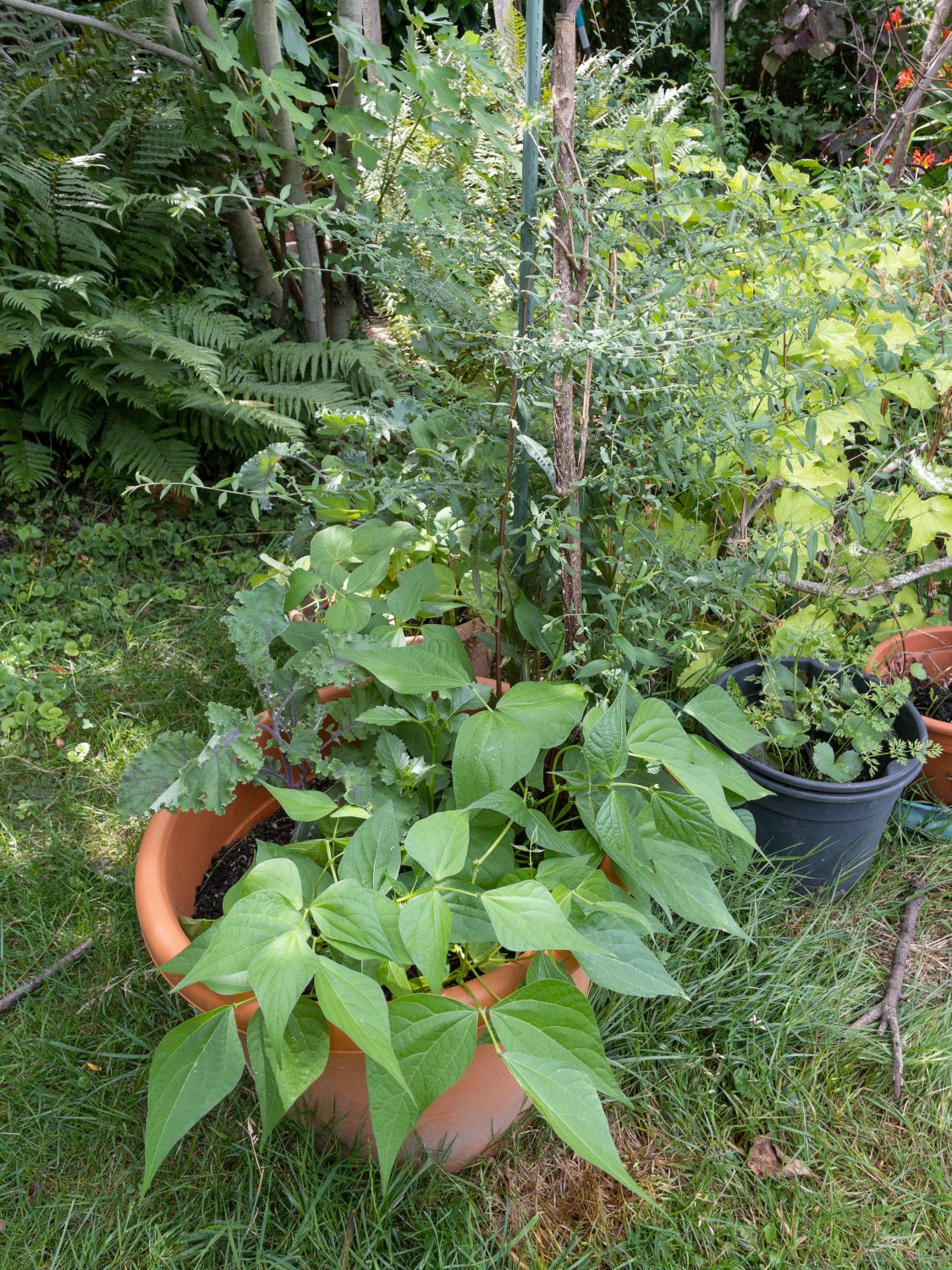 ToBaKo ist nur eine Kombination, welche ich in Pflanzkübeln aussäe und einpflanze. Mein Lieblingstopf besteht dieses Jahr aus der Aster „Lady in Black“ (Aster lateriflorus „Lady in Black“), einer Dahlie, Buschbohnen und einem roten Grünkohl. Die Dahlie will nicht richtig wachsen. Vermutlich hat sie die Überwinterung im Schopf nicht gut vertragen.