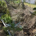 Fürs erste bringe ich ein Tarnnetz über dem Gemüsebeet an. Das wird hoffentlich dabei helfen, dass noch etwas wächst. Zur Befestigung des Tarnnetz schlage ich Einschlaghülsen in die Erde. Die Vierkantholmen stehen schon eine Weile im Schopf rum. Damit wollte ich das Tomatenhäuschen stabiler machen. Zur Zeit ist Schatten wichtiger, also kommen sie hier rein. Oben Haken rein schrauben, unten dicke Schrauben zu Besfestigung – fertig.