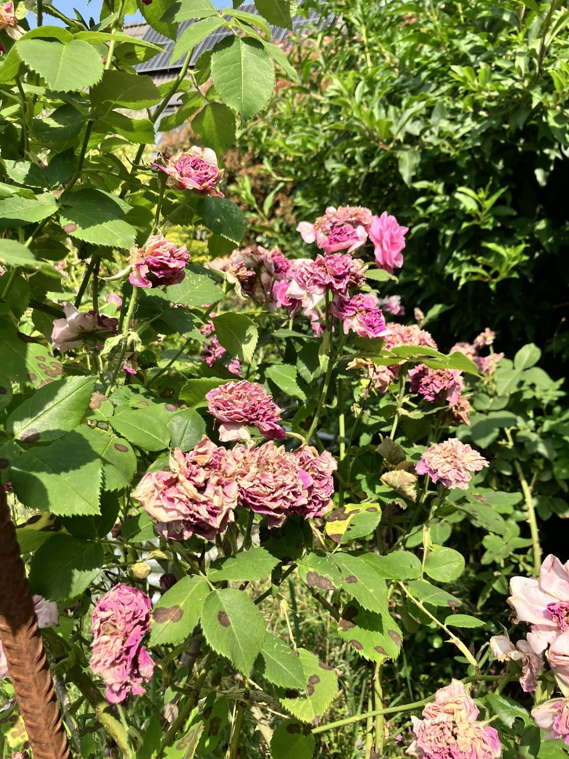 Wie wichtig der Schatten ist, wird am Beispiel meiner Rosen sichtbar. Die Rose in der Schatteninsel macht sich sehr gut. Schöne Blüten, gesunde Blätter. Gegenüber steht eine Rose fast den ganzen Tag über in der Sonne. Hier sind die Blüten der Rose am Stock vertrocknet. Die Blütenblätter haben es noch nicht einmal geschafft abzufallen. Getrocknete Blüten mal ganz anders.