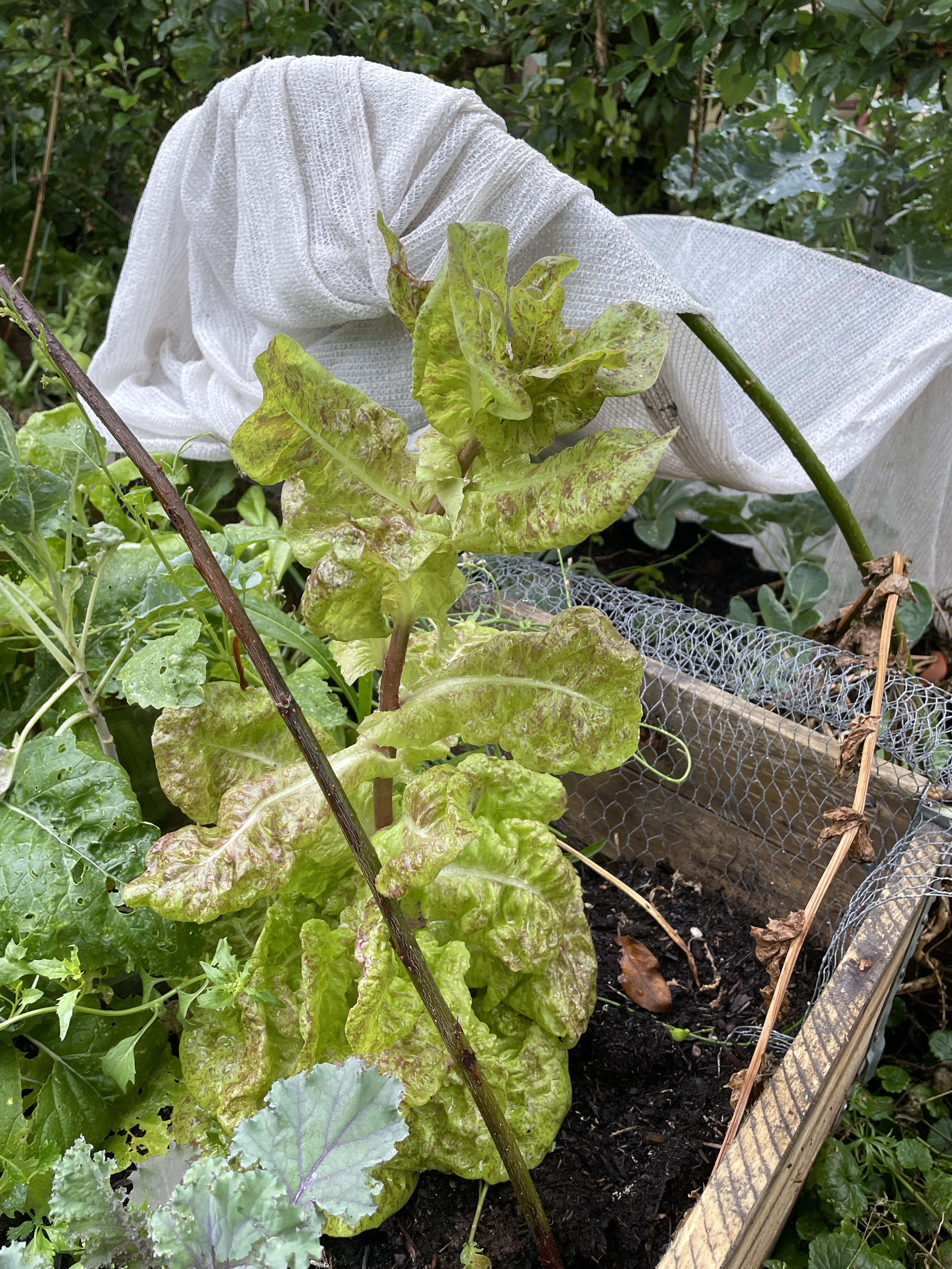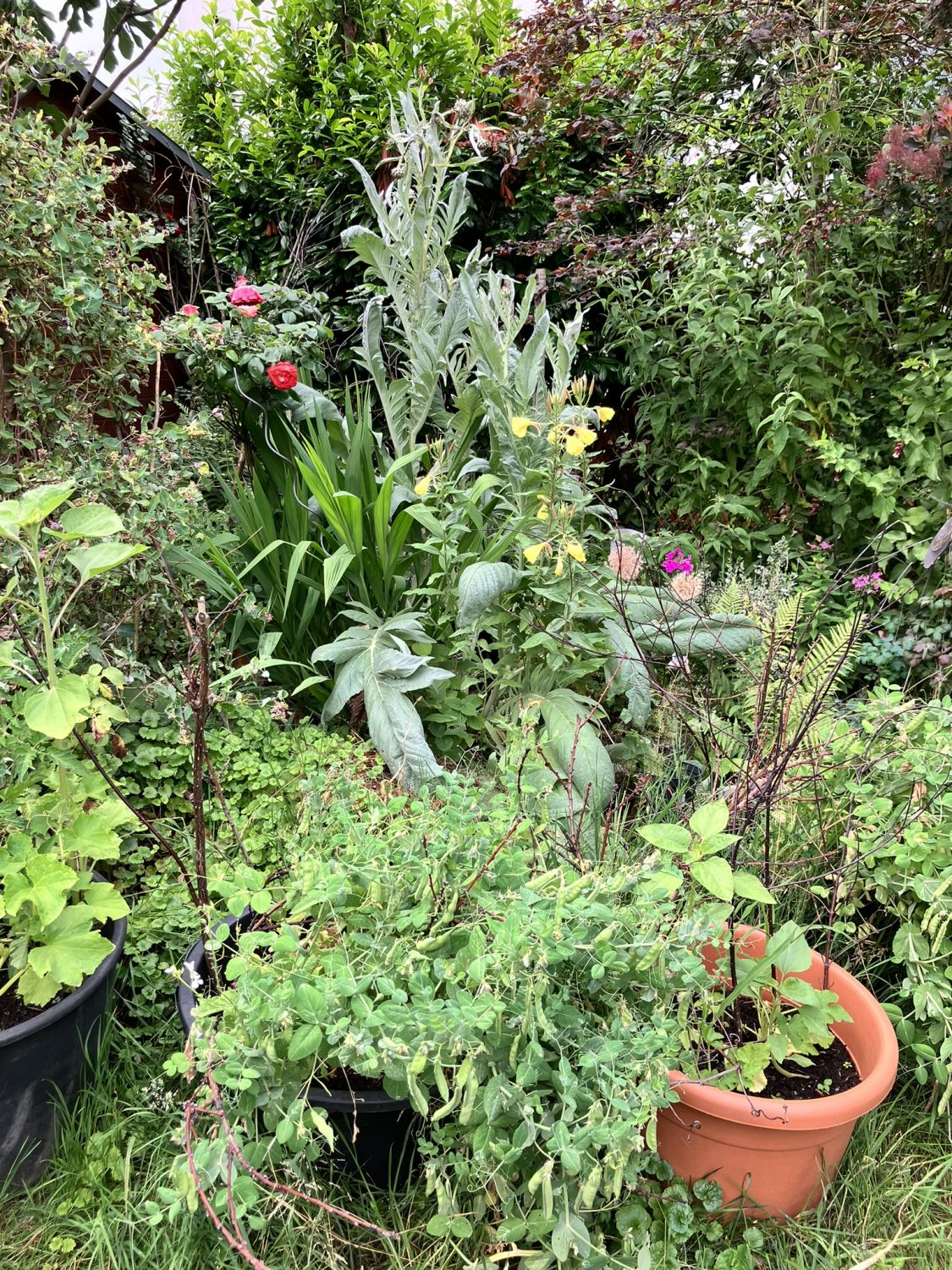 Einzig meine Schatteninseln sind ein „Lichtblick“ im Garten. Diese Schatteninseln bilden sich unter dem Blätterdach von zum Beispiel Judasbaum, Weidebogen, KiriKiri, Feigen und Perückenstrauch. Selbst eine der von mir ungeliebten Kirschlorbeerhecken hilft bei der Abschattung. Im Teilschatten dieses Blätterdaches stehen einige Pflanzkübel mit Gemüse, wie Erbsen und Zucchini. Was mich besonders freut: Hier wächst noch etwas. Allerdings auch hier nur mittels zusätzlichen Wassergaben.