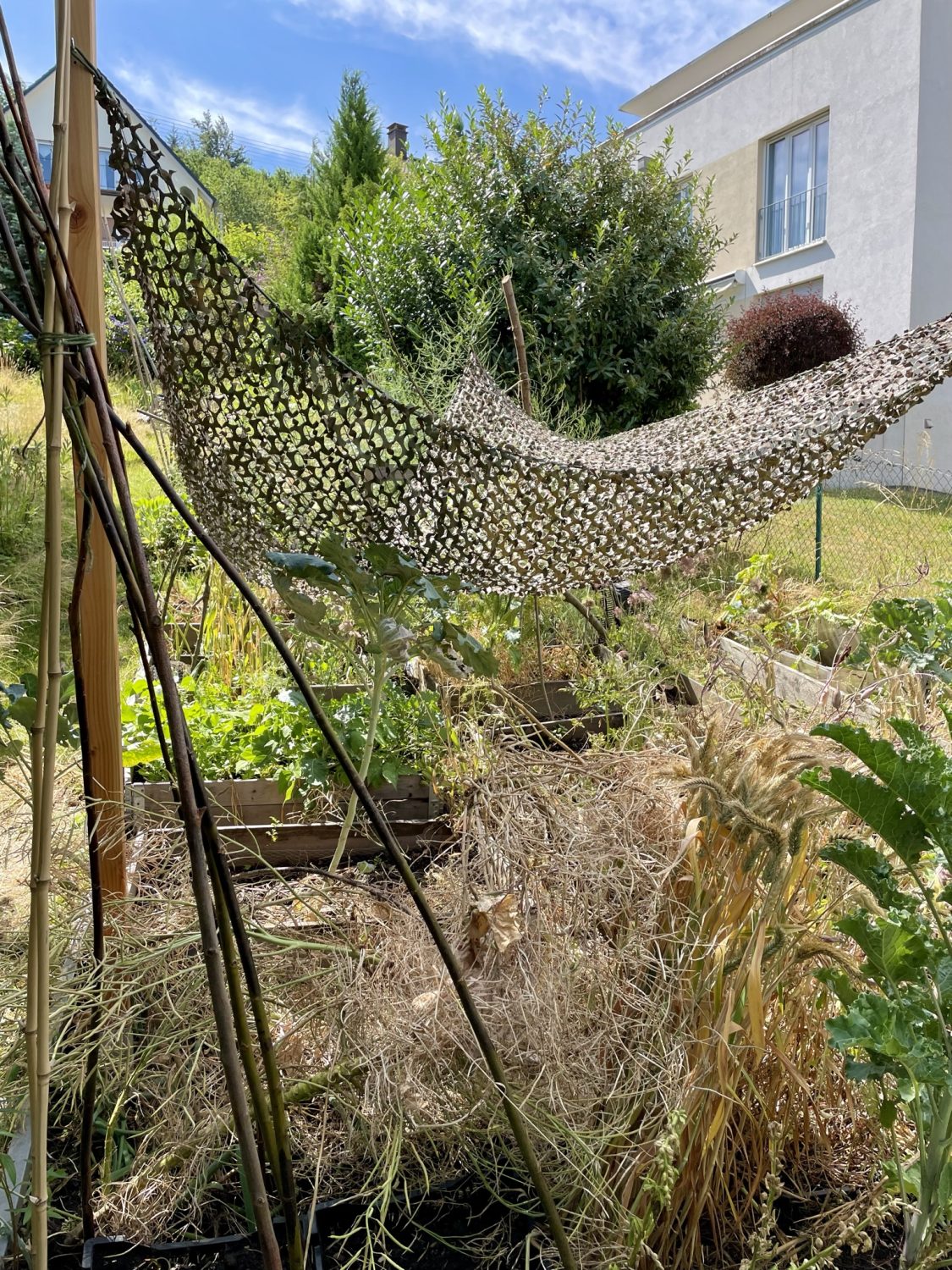 Das Tarnnetz ist die kurzfristige Lösung. Schatten durch Bäume und Hecken dauert etwas länger, bleibt aber weiterhin auf dem Plan für die Umgestaltung hier oben.