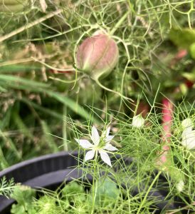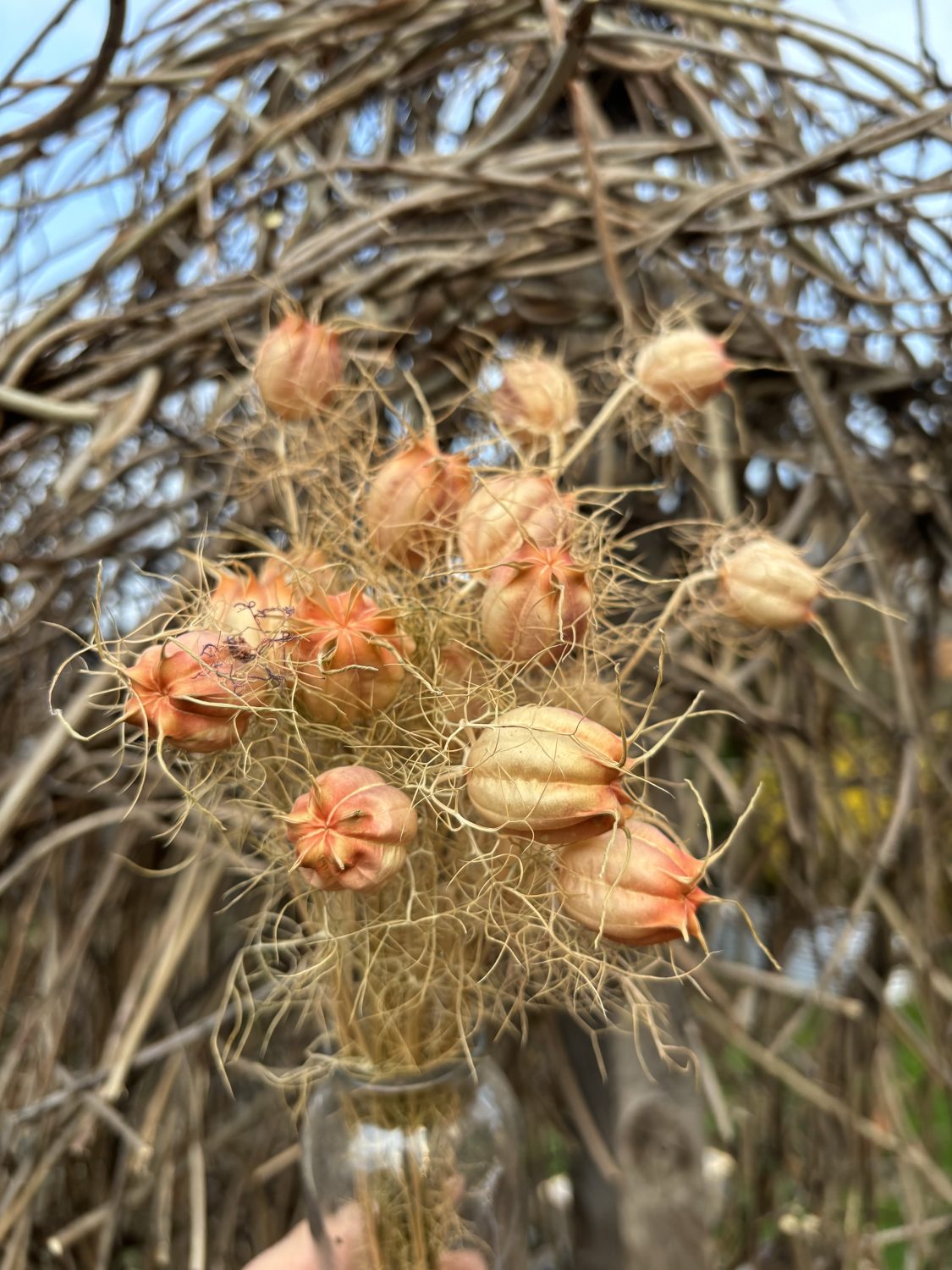 Die Samen haben mich bisher immer nur genervt. Rieseln sie doch in großer Zahl aus jedem trockenen Samenstand, sobald dieser bewegt wird. Bis zuletzt habe ich die abgeschnittenen Samenständen durch den Garten getragen. Um nur ja nicht zu viele zu verteilen. Die Samen habe ich dann im Mülleimer entsorgt. Eine „Jungfern-im-Grünen-Invasion“ wollte ich nicht haben.