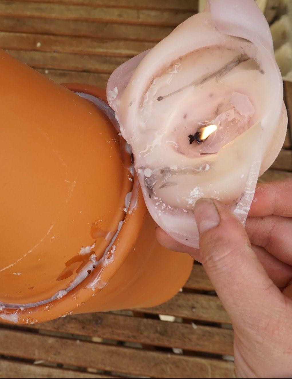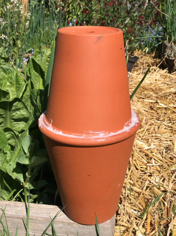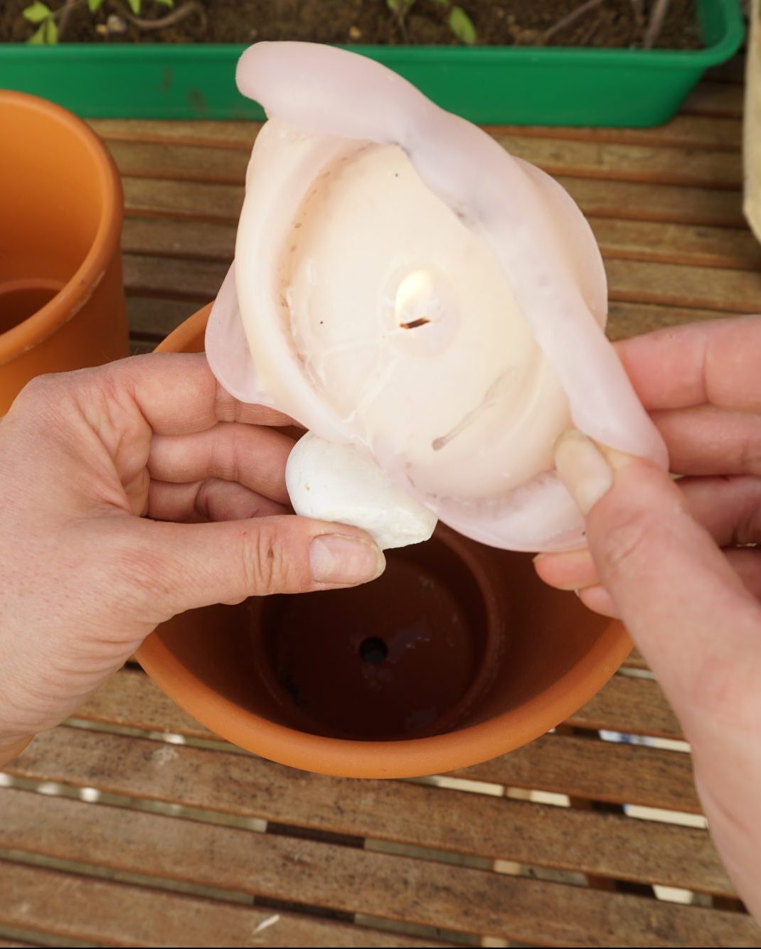 Zuerst wird der Kieselstein mit ordentlich Wachs auf das Bewässerungsloch des unteren Tontopfes befestigt. Wenn er fest ist, den Topf umdrehen und das Loch gut mit weiterem Wachs auffüllen. Dann den kleineren Topf auf den größeren stülpen und die Kante gut mit flüssigem Wachs verschließen. Ich habe den Tipp bekommen, dass es auch mit Fliessenklebern geht. Man könnte es auch mit Silikon machen, aber das ist mir persönlich suspekt. Es muss ja nicht 100% dicht sein oder besonders gut aussehen. Das Wasser sollte nur nicht zu schnell versickern – so die Theorie.