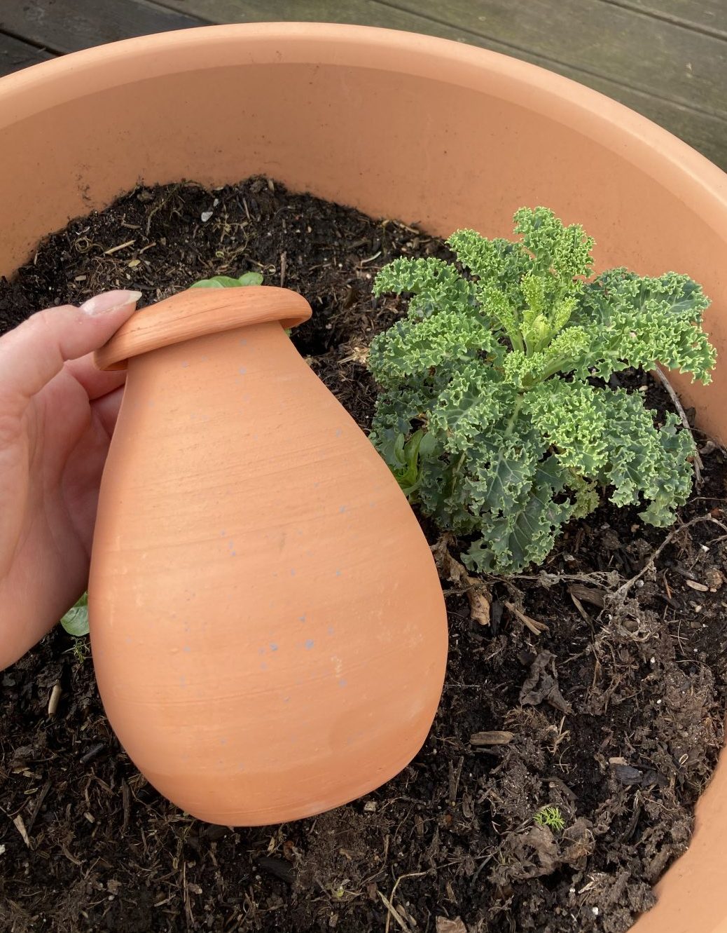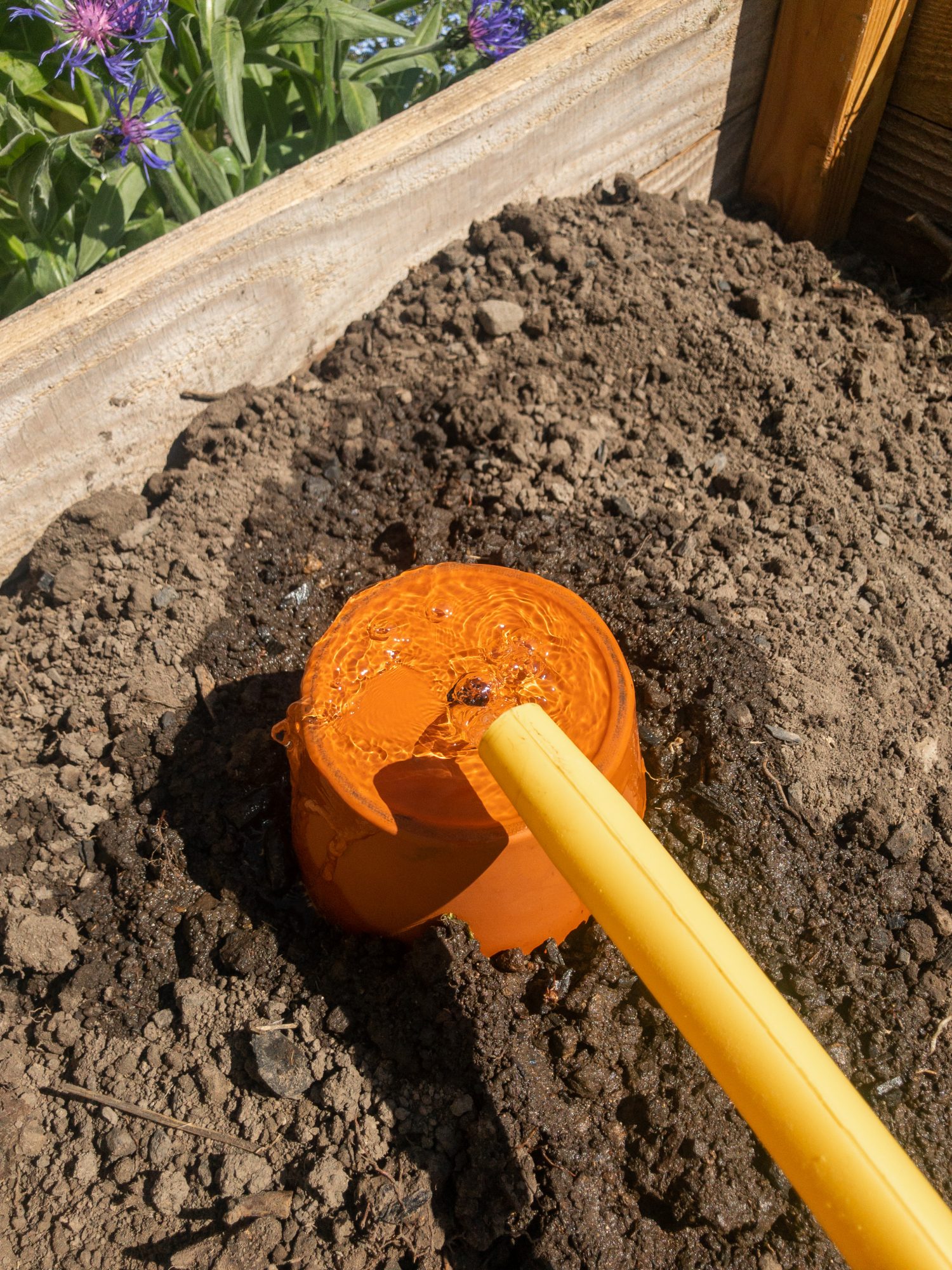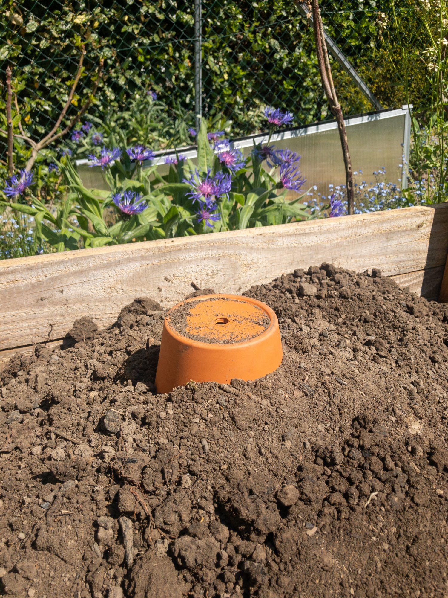 Tipp: Drückt zuerst die Tontülle OHNE die Flasche in die Erde und setzt dann die mit Wasser gefüllte Flasche. Meine erste Tontülle habe ich gleich mal zerstört, als ich sie mit der Flasche in die Erde drücken wollte.