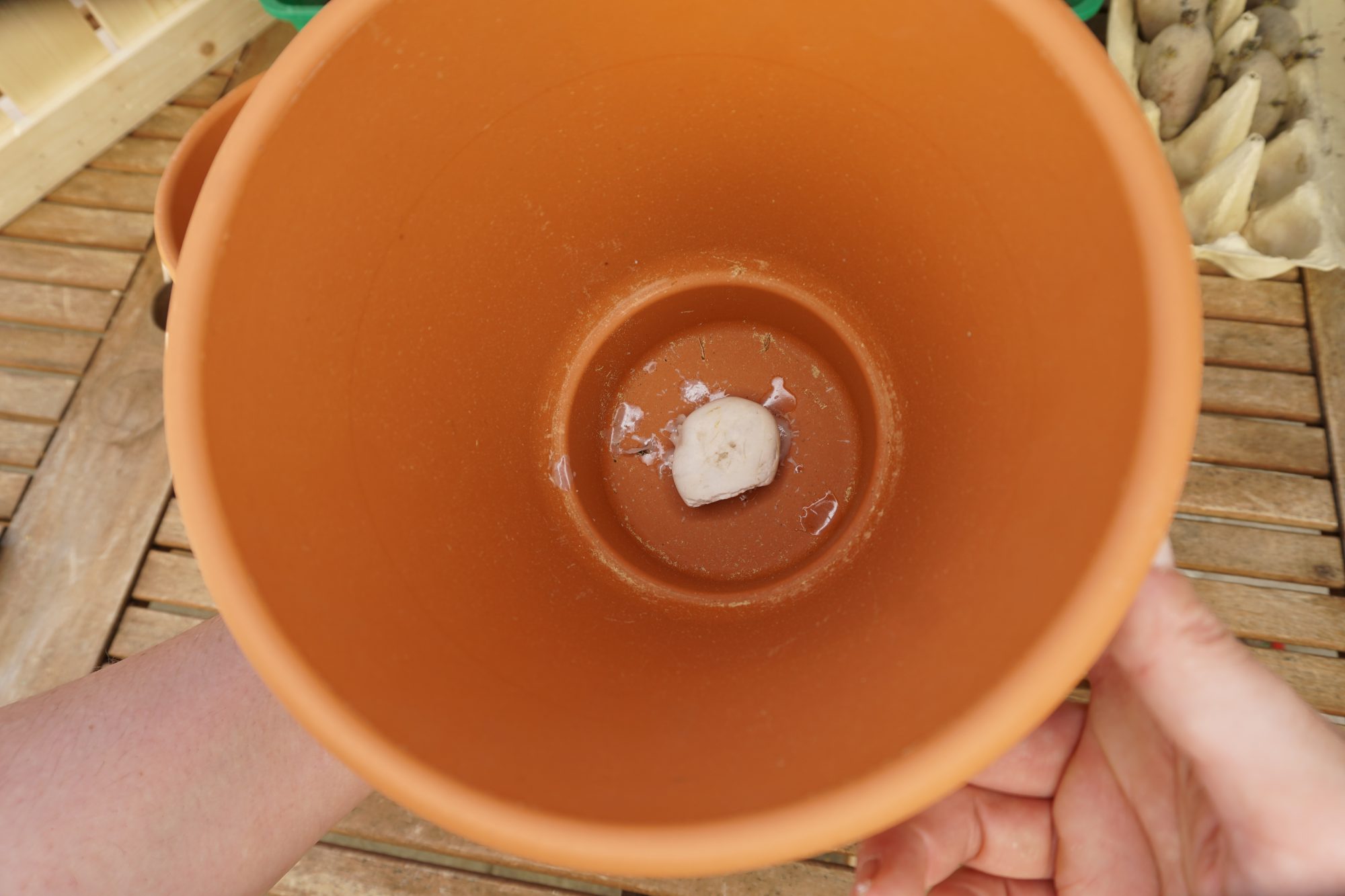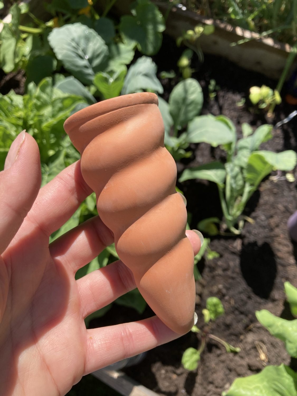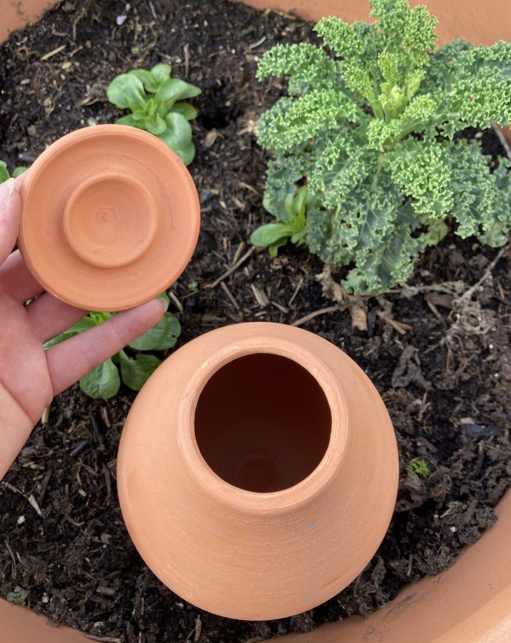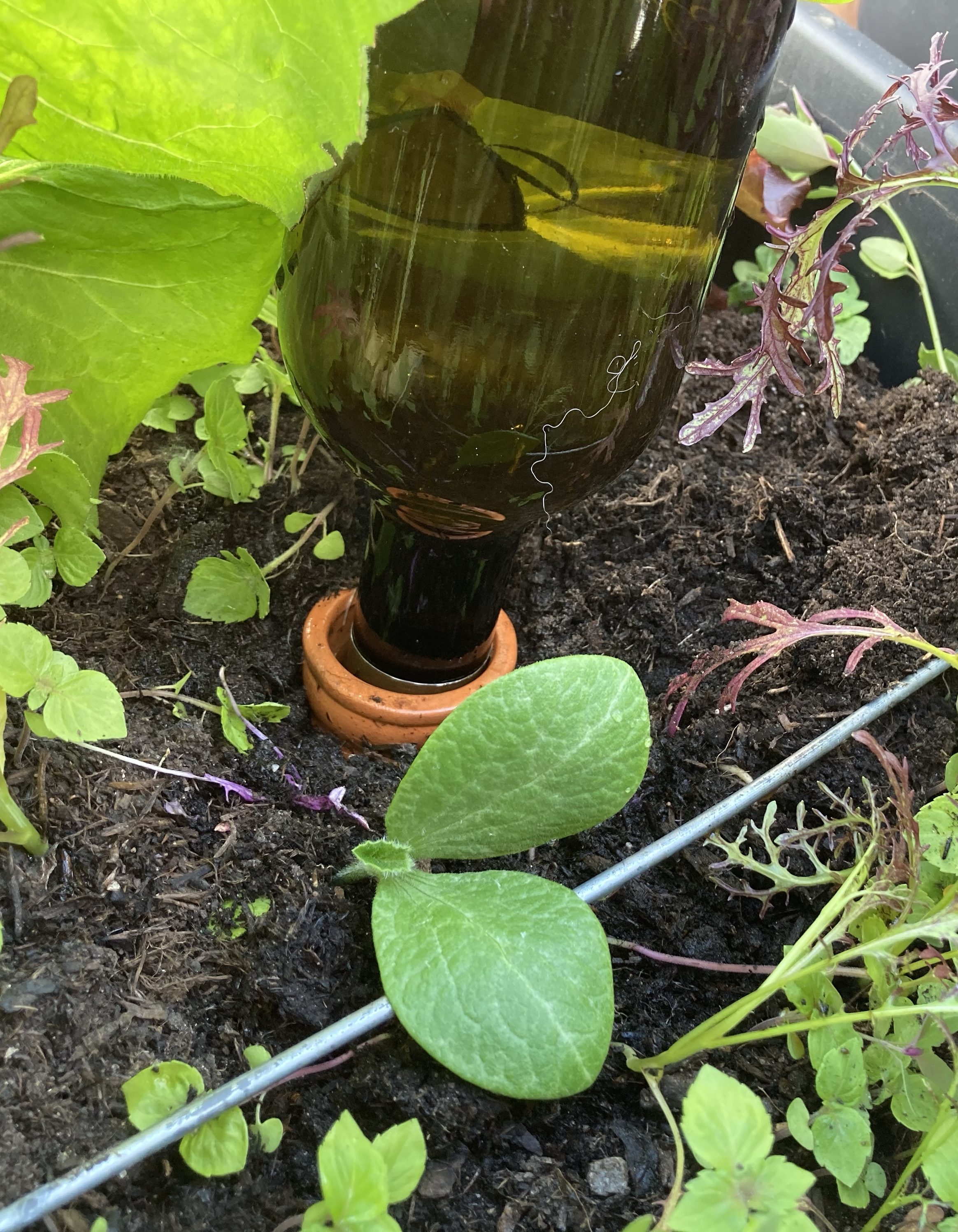 Tipp: Drückt zuerst die Tontülle OHNE die Flasche in die Erde und setzt dann die mit Wasser gefüllte Flasche. Meine erste Tontülle habe ich gleich mal zerstört, als ich sie mit der Flasche in die Erde drücken wollte.