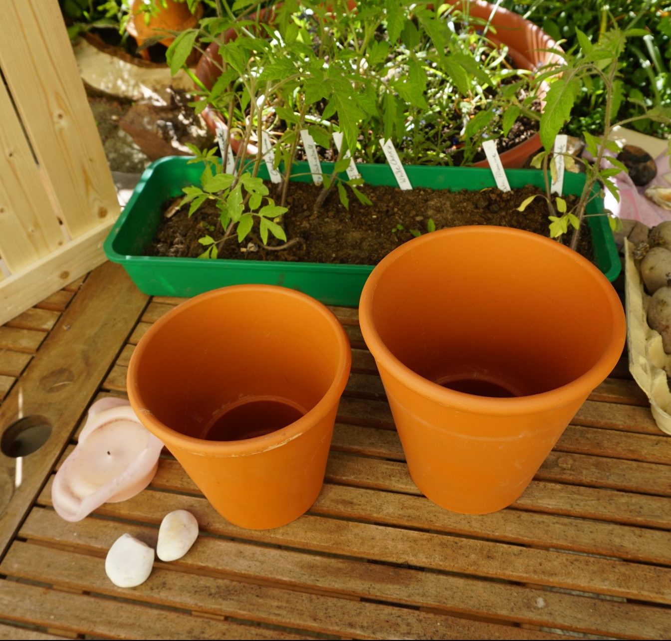 Auch bei uns gibt es diese Tongefäße inzwischen seit einiger Zeit zu kaufen. Aber auch die sind recht teuer. Also muss es die Do-it-yourself Variante sein. Zwischenzeitlich gibt es viele gute Bastelanleitungen. Also probiere ich es heute einfach mal aus. Ich habe dafür zwei Rosentontöpfe in unterschiedlicher Größe gekauft. Sie sollen gut ineinander passen, wenn sie mit den Öffnungen aufeinander gestülpt werden. Ich habe dann noch die alten Kerzen vom vorletzten Adventskranz und eine flachen Kieselstein verwendet.
