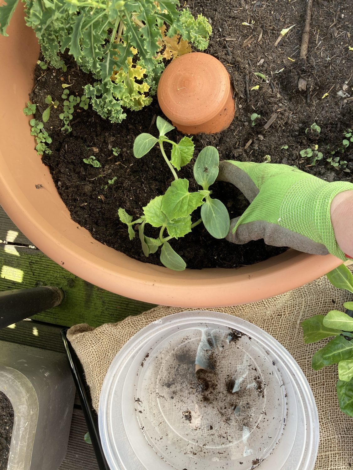 Gurken und Zucchini haben einen hohen Wasserbedarf. Für sie muss es schon eine Olla sein, wenn es um die Wasserversorgung im Balkongarten geht. Ob selbst gebaut aus zwei Tontöpfen oder gekaufte Olla – es hilft, wenn sie neben den Pflanzen eingegraben werden. Bis zur Halskrause sitzen sie dann in der Erde. So versorgen sie die nähere Umgebung mit Wasser.