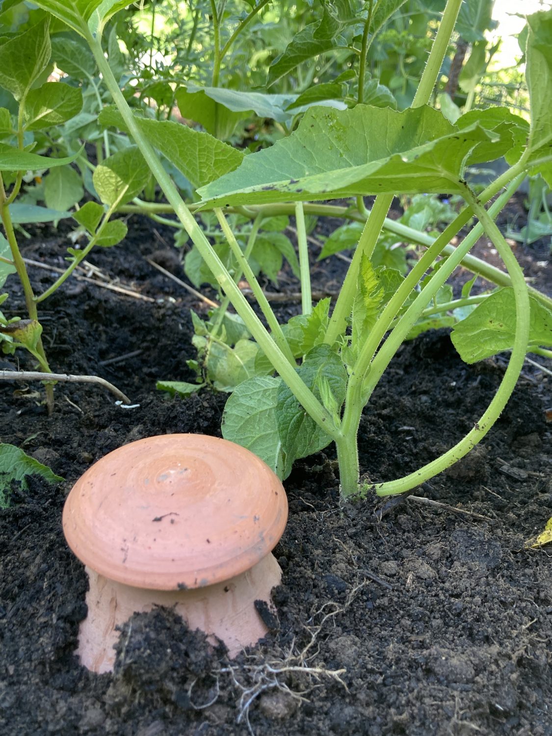 Das uralte Prinzip der Ollas ist mir schon vor Jahren auf einer amerikanischen Seite aufgefallen. Ollas sind bauchige Ballons aus unglasiertem Ton. Durch das poröse Material diffundiert das darin enthaltene Wasser aus den eingegrabenen Ollas in genau der richtigen Menge in den Boden. Die Wurzeln der umliegenden Pflanzen sind immer gut versorgt und es wird kein Wasser verschwendet.