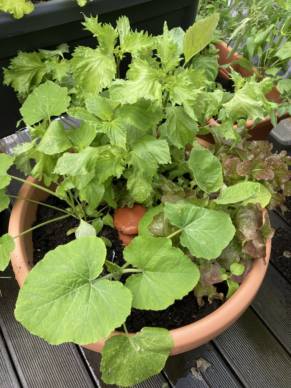 Ganz wichtig: Wer wie ich eine Südterrasse hat, muss unbedingt für Schatten sorgen! Wenn ich bei Sonnenschein über die Terrasse laufe, brennen mir die Fußsohlen. Bei so einer Hitze überlebt keine Pflanze im Topf. Es muss ein Sonnensegel über die Terrasse. Bei einem hellen Segel kommt noch genügend Licht für das Pflanzenwachstum. Jetzt nur noch Daumen drücken, dass uns die 40° C erspart bleiben. Dann gibt es eine gute Ernte im Kübelgarten.