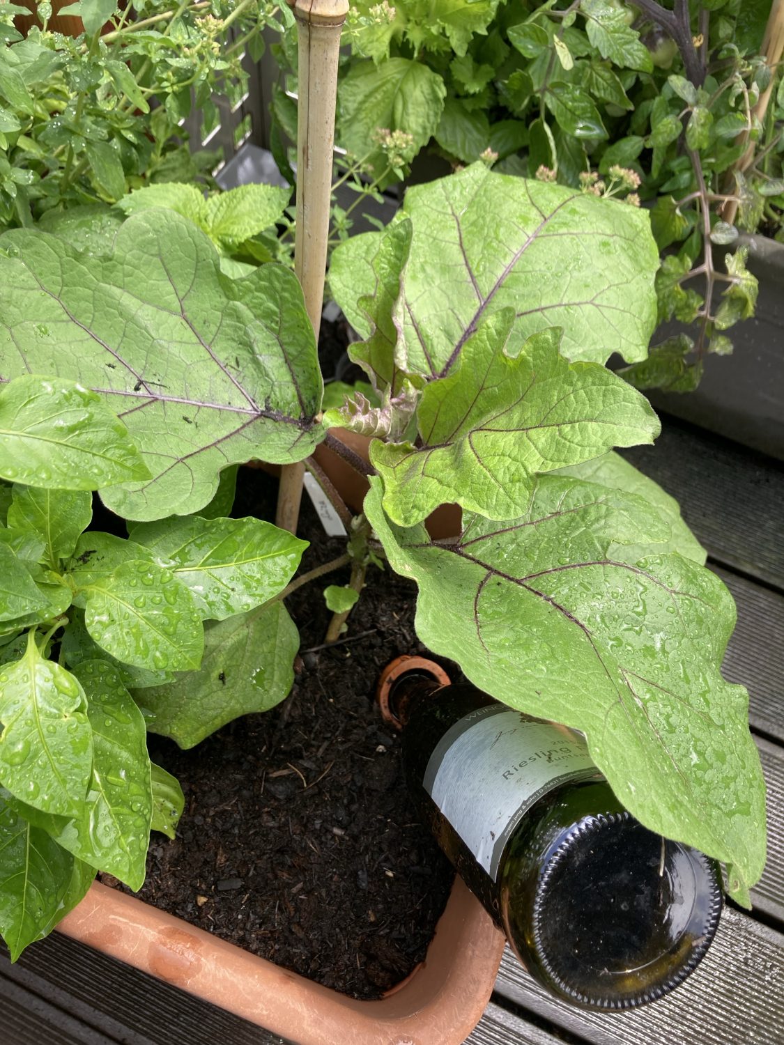 In meine 50 cm Pflanzkübel (40 l – 60 l Volumen) setze ich eine 2 Lieter Olla. Darum herum können zum Beispiel 4 Gurken Pflanzen gesetzt werden. In Pflanztöpfe mit 40 cm (25 l -35 l Volumen) setze ich ein kleine Olla mit knapp 1 Lieter. Sie versorgt dann zum Beispiel eine Tomate und eine Chili Pflanze. Zusätzlich wird die Erde abgemulcht, das heißt bedeckt. So verringert sich die Verdunstung. Zusätzliches Gießen ist aber gerade in sehr heißen Phasen trotzdem nötig.