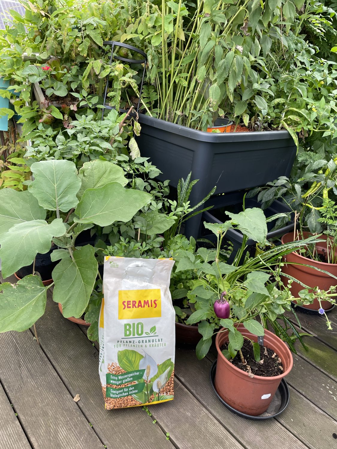 Nachgedüngt wird mit der flüssigen Pflanzenkohle und dem eigenen Wurmhumus. Das verbessert die Erde auf Dauer noch mehr. Ich genieße jetzt erst einmal meine Ernte im Balkon Gemüse Garten.