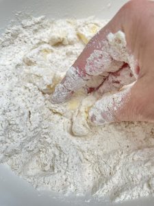 Dann wird die sehr weiche Butter in kleine Stücke geschnitten und mit viel Geduld und Fingerspitzengefühl in die Mehl-Zucker Mischung „eingestreichelt“.