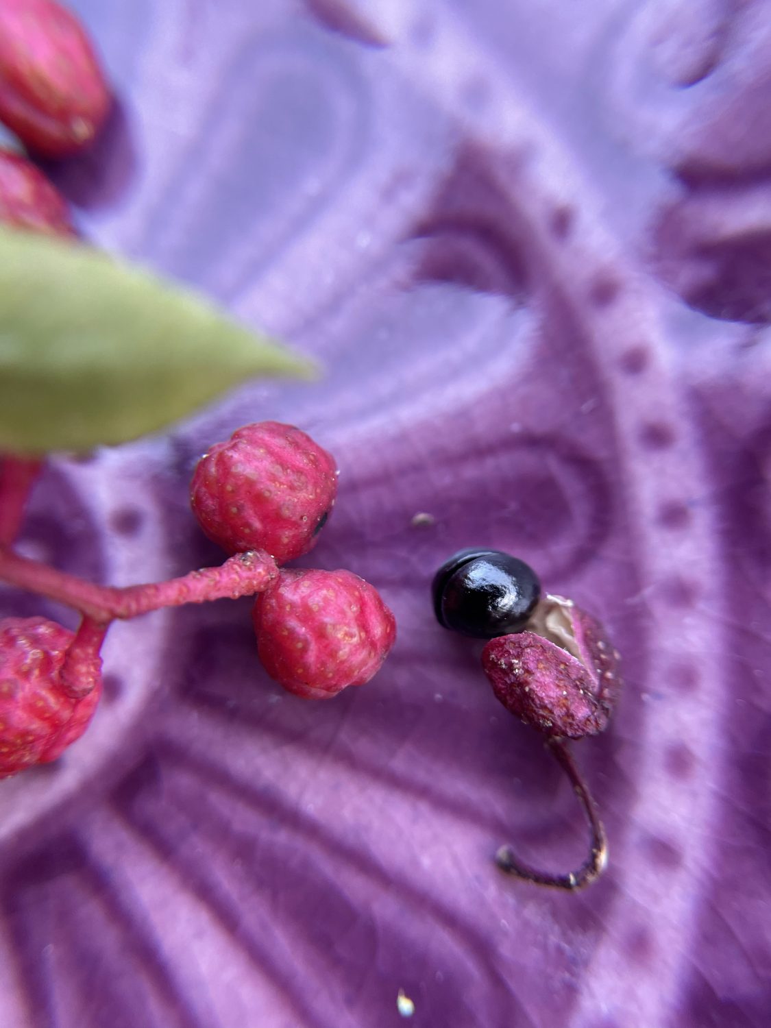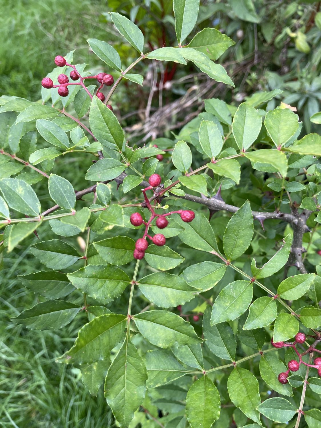 Shiso ist aber nicht das einzige Kraut oder Gewürz aus Fernost, welches in Garten und Balkongarten von mir kultiviert wird. Neben Kaffir Limette (Citrus hystrix) und Curryleaf (Murraya koenigii) finden sich hier der chinesische Schnittknoblauch (Tulbaghia violacea), der chinesische Gewürzstrauch (Elsholtzia stauntonii) und der Szechuan Pfeffer (Zanthoxylum simulans). Wobei, der Pfefferstrauch ist eine Zitruspflanze und kein echter Pfeffer. Alle Teile dieser Pflanze sind richtig scharf, selbst die Blätter. Leider ist er auch übersät mit kleinen Dornen. Selbst englang der Blattrispe an der Unterseite der Blätter finden sich kleine Wiederhaken. Ansonsten könnte man auch mit den Blättern würzen.