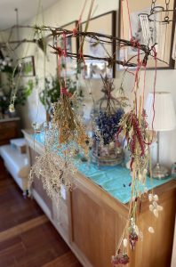Die Blauraute und weitere Kräuter trockne ich im Wohnzimmer an einem selbst geflochtenen Weidering. Hier hängen die Kräuter luftig im Schatten und verschönern das Zimmer. Auch die Kräuter für Tee und Gin trockne ich gerne hier.