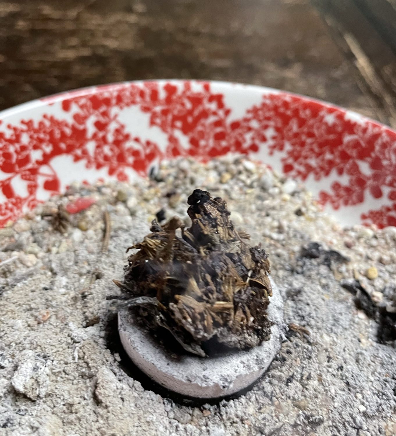 Zum Räuchern lege ich die Räucherkohle in eine mit Sand gefüllte, feuerfeste Schale. Die Schale steht widerum auf einer Schieferplatte. Die glühende Kohle nie unbeaufsichtigt lassen.