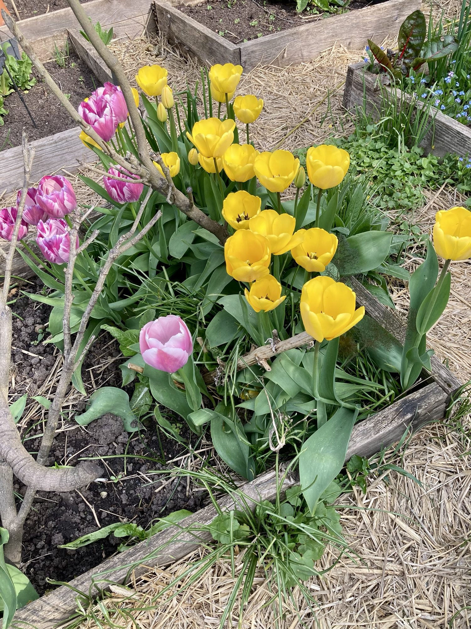 Nachtrag Januar 2026: Die späte Pflanzung hat funktioniert, die Beete waren und sind Ende April voll mit blühenden Tulpen. Auch diesen Januar stecke ich wieder Zwiebeln von der Resterampe in den Boden. Der Frühling kann kommen.