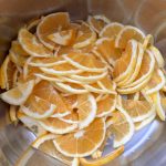 - Die Orangen mit heißem Wasser abspülen und mit einem Sparschäler schälen. Die Zesten kommen zum Teil mit in die Marmelade. Die restliche Schale kann getrocknet werden für ein Orangen Salz etwa.