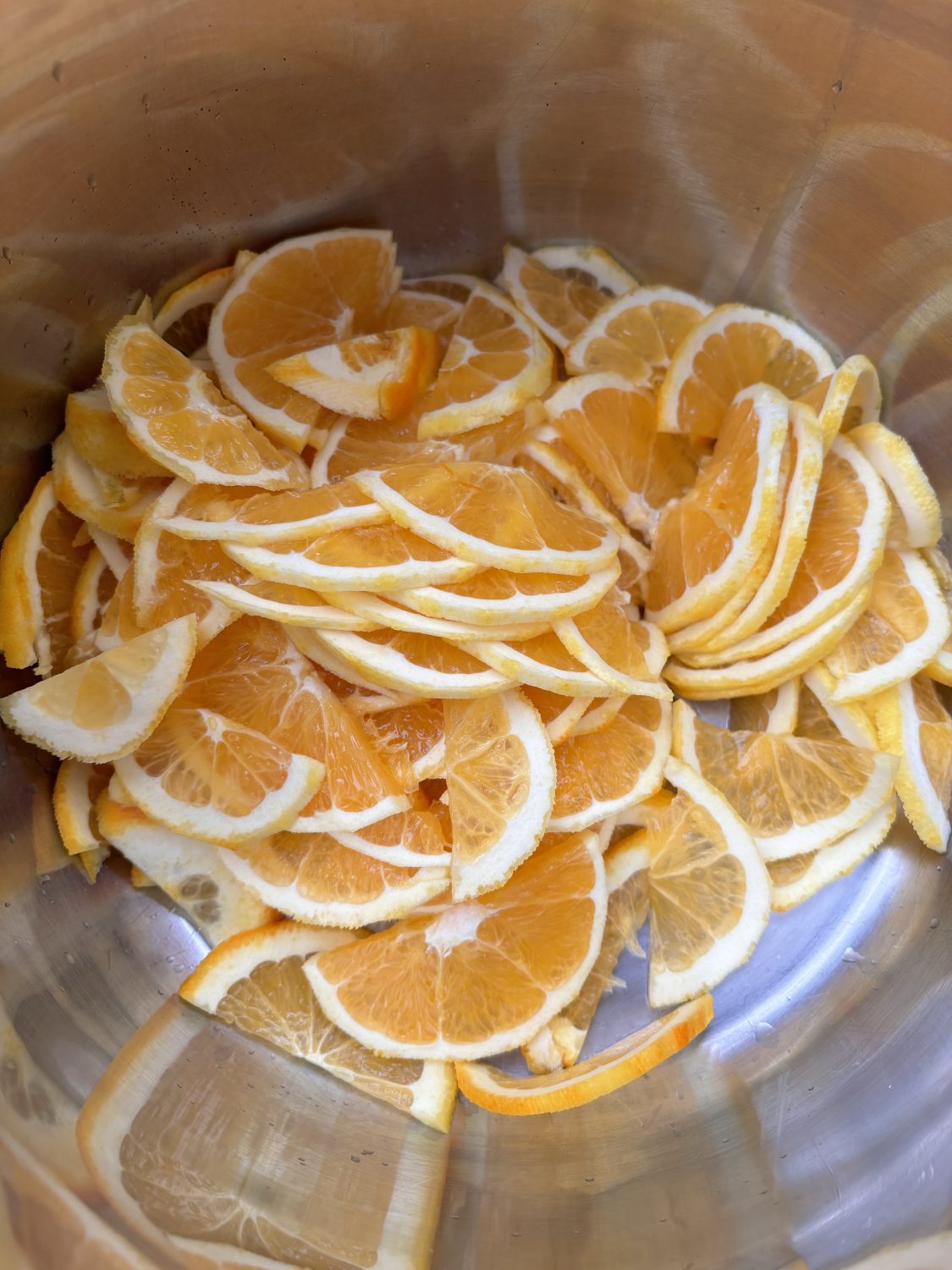 - Orangen halbieren und in feine Halbkreise schneiden. Aufkochen und 45 Minuten köcheln, dann die Orangen pürieren und abkühlen lassen.