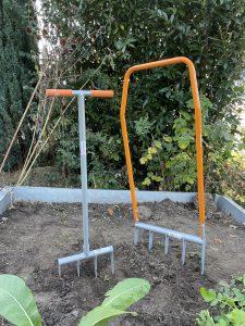 Um es den Bäumen noch einfacher zu machen, habe ich mit der kleineren Broadfork die Erde der Baumscheibe zusätzlich aufgelockert.