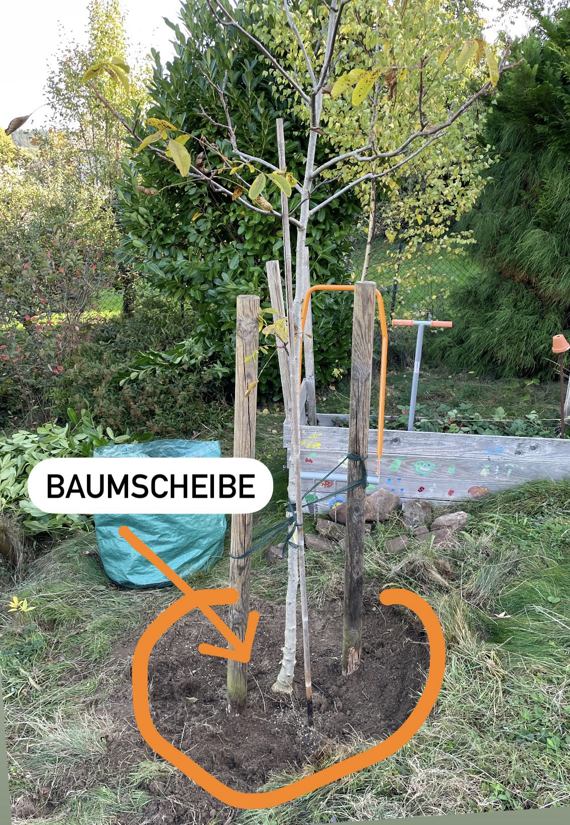 Als Baumscheibe wird die Fläche rund um den Stamm des Baumes bezeichnet. Der sollte bei den jungen Bäumen mindestens einen Durchmesser von 1,50 m haben. Möglichst Unkrautfrei. Nur so werden die jungen Bäume ausreichend mit Nährstoffen versorgt.