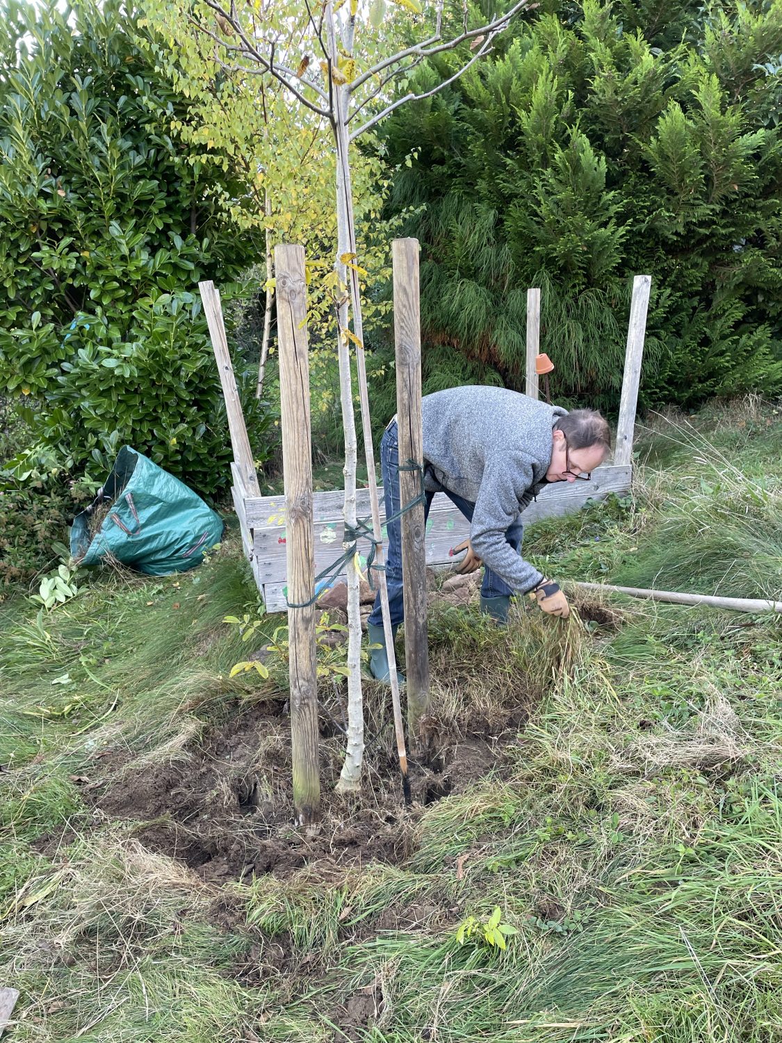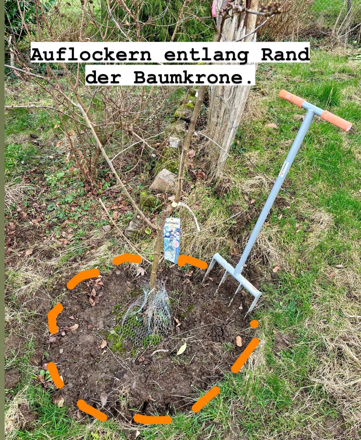 Um es den Bäumen noch einfacher zu machen, habe ich mit der kleineren Broadfork die Erde der Baumscheibe zusätzlich aufgelockert.