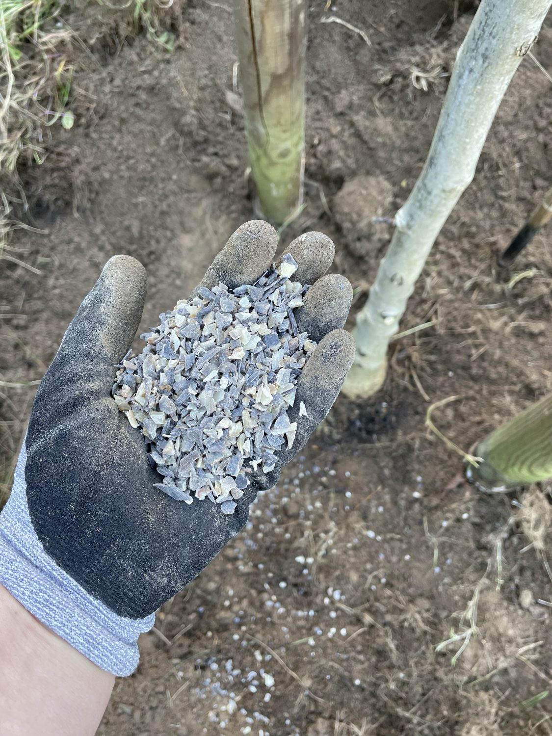 Deshalb der Arbeitsauftrag: Grasnarbe und Unkraut entfernen und mehrere Hand voll Hornspäne rund um die Bäume einarbeiten. Ja, ich habe auch wirklich Hornspäne gestreut und eingearbeitet. Die organische Düngung – nur mit Kompost – hatte offensichtlich nicht ausgereicht.