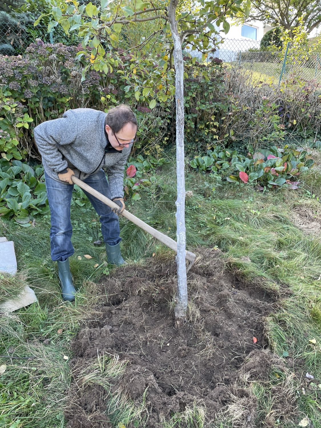Der Hinweis auf Instagram, ich könne die Baumscheibe doch wie in einem Perma-Waldgarten mit Gemüse bepflanzen, sehe ich etwas kritisch. Klar, nackter Boden sollte in einem gesunden Perma-/Biogarten nicht vorkommen. Doch direkte Nährstoffkonkurrenz in Form von hungrigem Gemüse auf eine Baumscheibe zu pflanzen – macht bei jungen Bäumen wenig Sinn. Vielleicht säe ich ein paar Lupinen oder Erbsen ein. Die bringen dann wenigstens Stickstoff in die Erde. Das war’s dann aber.