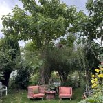 Nach einer Bildersuche im Internet kam ich dann auf den KiriKiri. Seit dem schauen wir diesem Baum beim wachsen zu. Und ja, er ist uns ans Herz gewachsen. Ganz besonders wegen seinem Schatten, welcher den Aufenthalt im Garten im Hochsommer überhaupt erst möglich macht. Inzwischen haben wir hier eine Sesselgruppe aufgestellt. Hier trinken wir morgens gerne unseren Kaffee. Nachmittags dann unseren Tee.