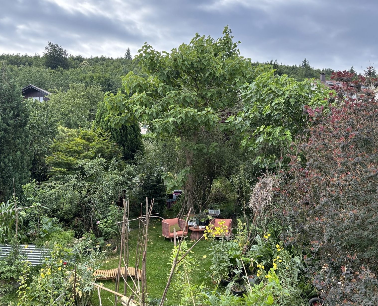 Nach einer Bildersuche im Internet kam ich dann auf den KiriKiri. Seit dem schauen wir diesem Baum beim wachsen zu. Und ja, er ist uns ans Herz gewachsen. Ganz besonders wegen seinem Schatten, welcher den Aufenthalt im Garten im Hochsommer überhaupt erst möglich macht. Inzwischen haben wir hier eine Sesselgruppe aufgestellt. Hier trinken wir morgens gerne unseren Kaffee. Nachmittags dann unseren Tee.