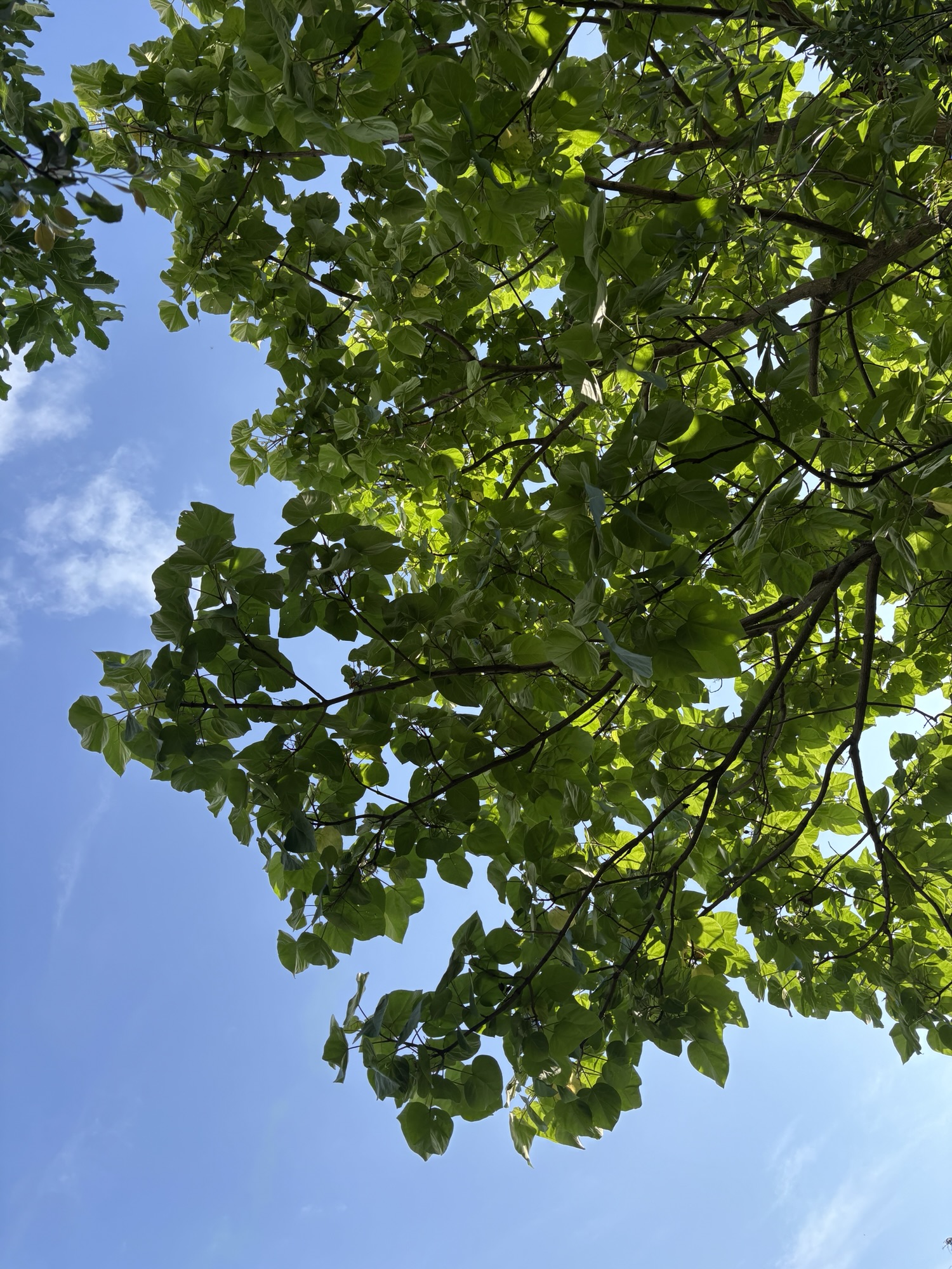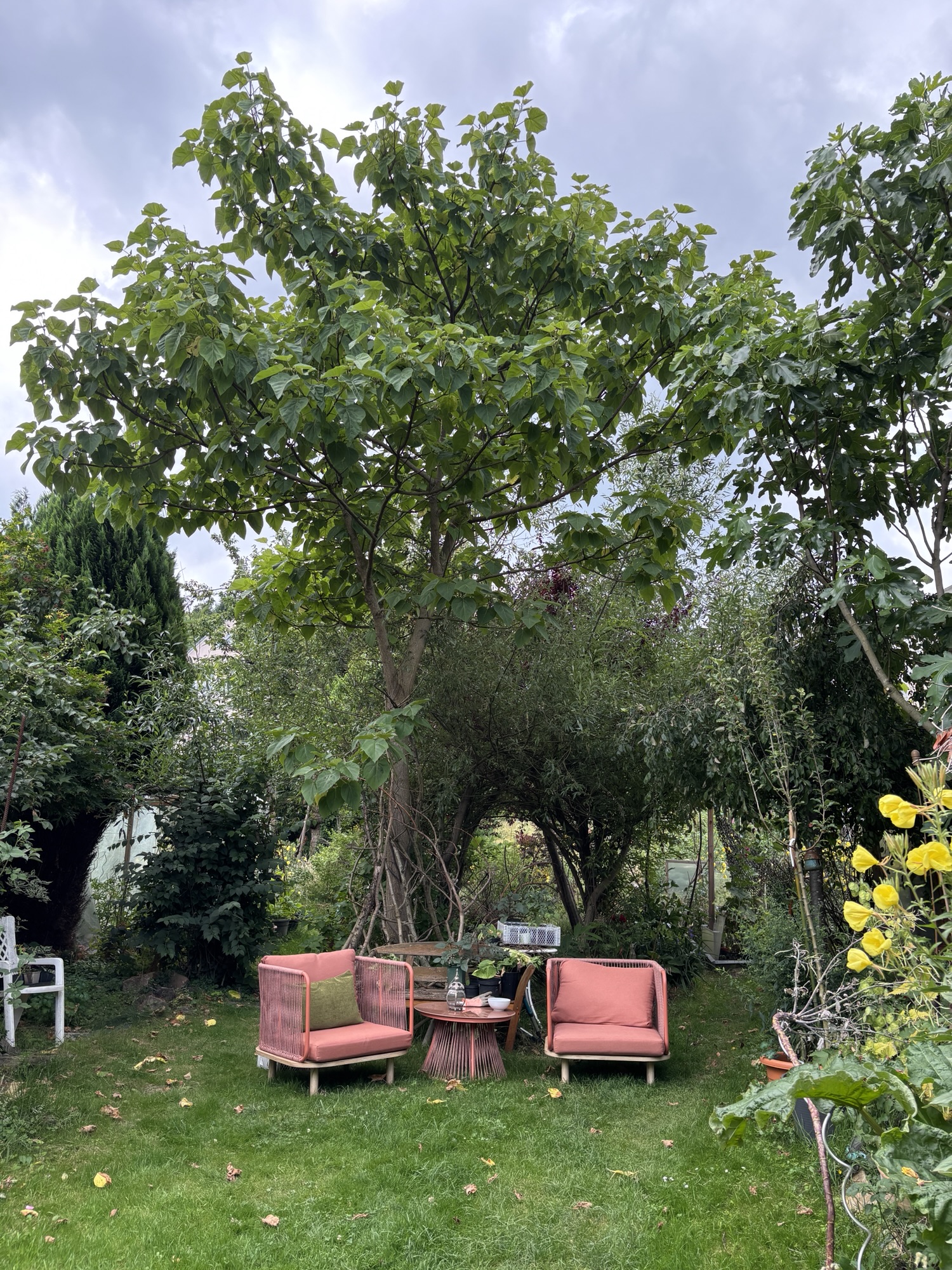 Doch ich bin für diesen Baum wirklich dankbar. Mit seinen riesigen Blättern und seiner stattlichen Größe spendet er viel notwendigen Schatten im Garten. In gerade einmal 6 Jahren hat er locker eine Höhe von gut 8 Metern erreicht. Bevor sich dieser Baum hier breit gemacht hat, konnte man sich im Sommer tagsüber nicht im Garten aufhalten.