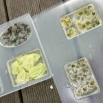 Die verwendetem Blüten und Kräuter sind absolut Giftfrei – da bin ich mir sicher. Sie stammen ausnahmslos aus dem eigenen Garten. Die Gänseblümchen und die Blüten der Fruchtsalbei Sorte Salvia microphylla ‚Royal Bumble‘ habe ich etwas antrocknen lassen. Die Blätter der Kaffirlimette kommen frisch in die Seife.